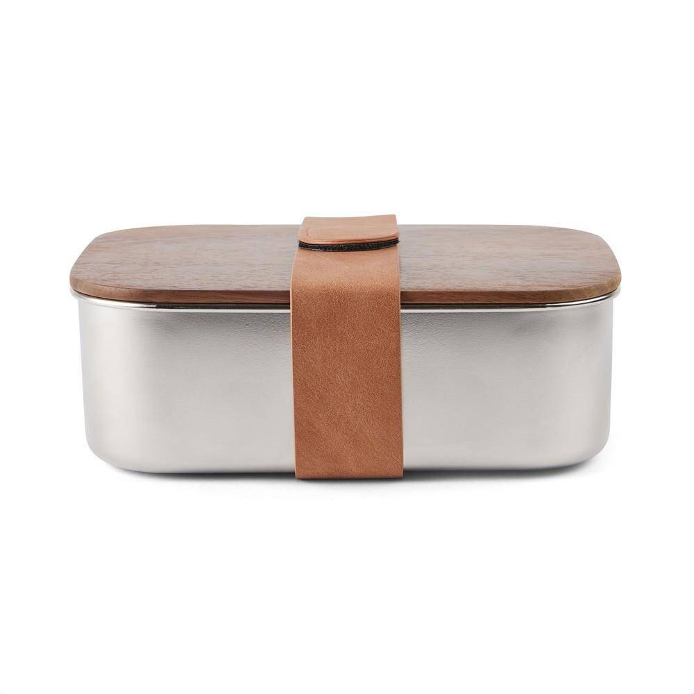 Pudełko śniadaniowe, lunchbox, drewniana pokrywka, pasek na rzep, wykonane ze stali nierdzewnej z recyklingu, całkowita zawartość materiałów z recyklingu obliczona na