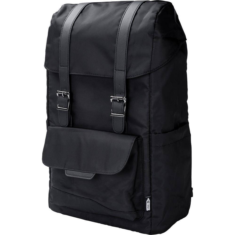 Plecak z klapą wykonany z RPET, dwie kieszenie boczne, przednia kieszeń zamykana na magnes, wnętrze zamykane na sznurek, kieszeń na laptopa 15", wodoodporna powłoka na torbie