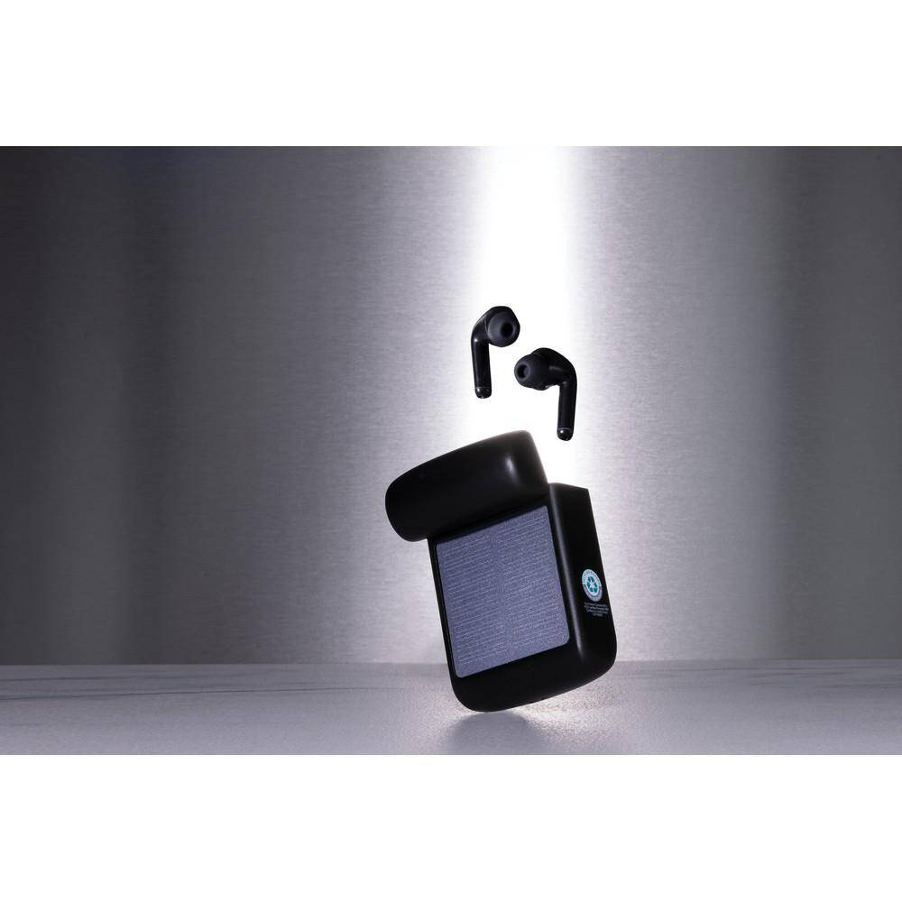 Słuchawki bezprzewodowe BT 5.3, zintegrowany panel słoneczny do ładowania słuchawek, prędkość ładowania solarnego 5V/0,05A, wbudowany mikrofon, funkcja odbierania połączeń, wykonane z ABS z recyklingu z certyfikatem RCS, całkowita zawartość materiałów z recyklingu obliczona w oparciu o wagę całkowitą przedmiotu: 19%, czas odtwarzania na średnim poziomie głośności do 5 godzin, zasięg do 10 m, kabel z TPE z recyklingu z certyfikatem RCS w komplecie, w pudełku z papieru kraftowego z certyfikatem FSC® mix