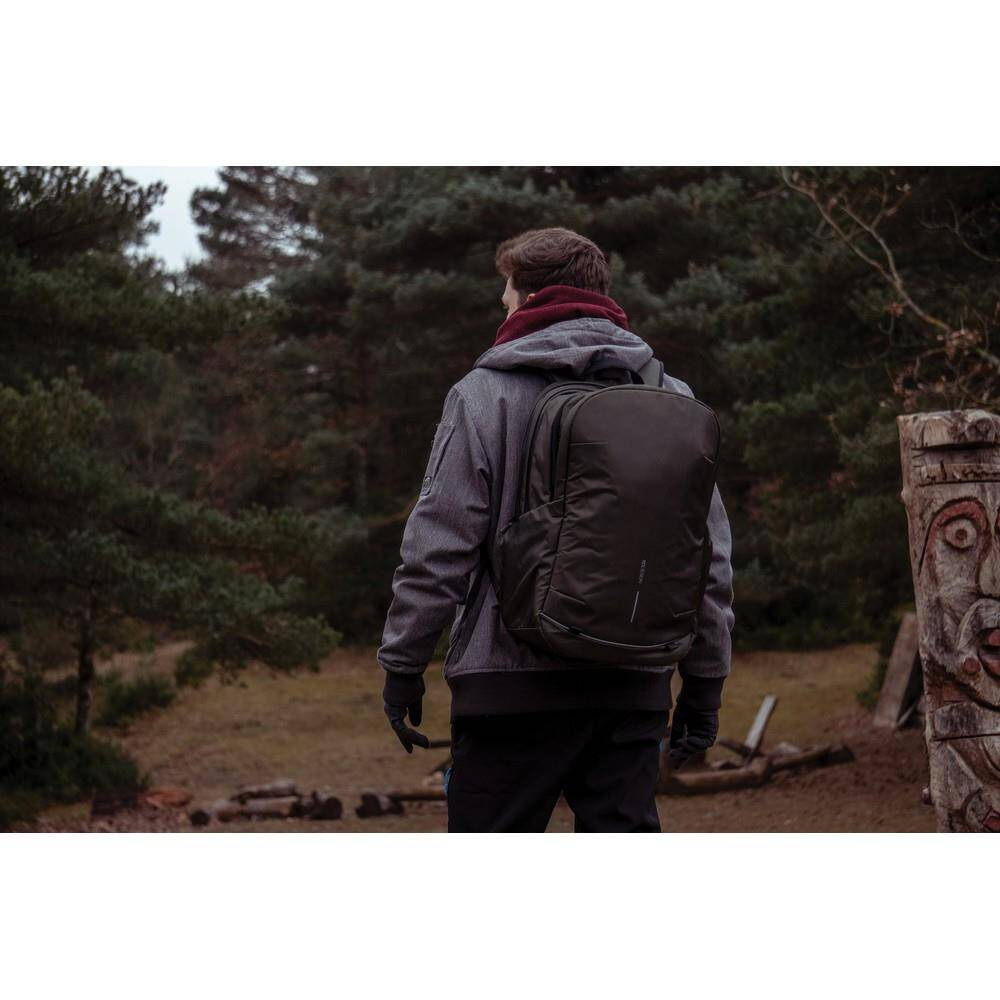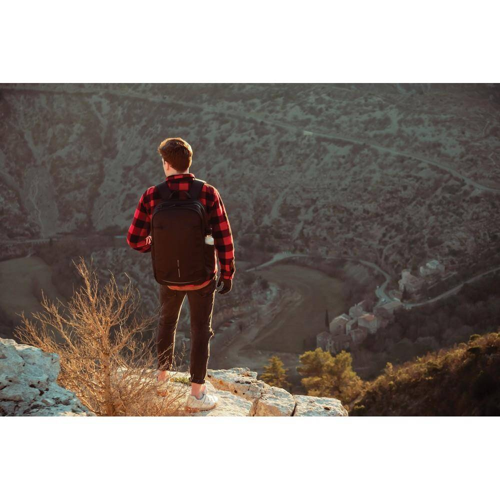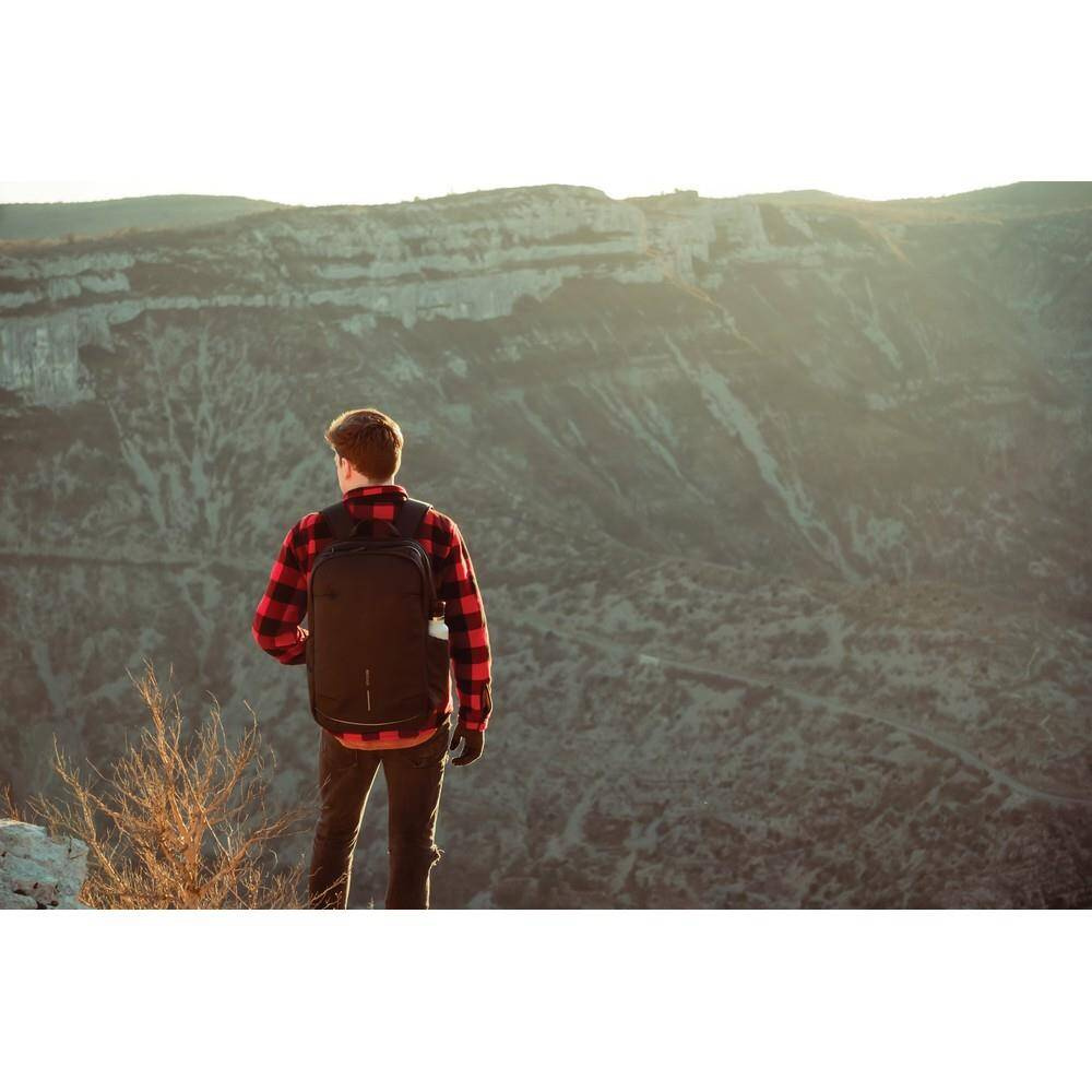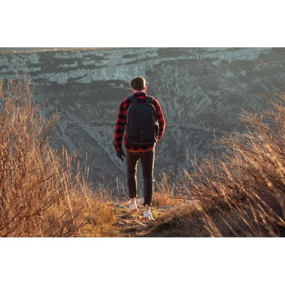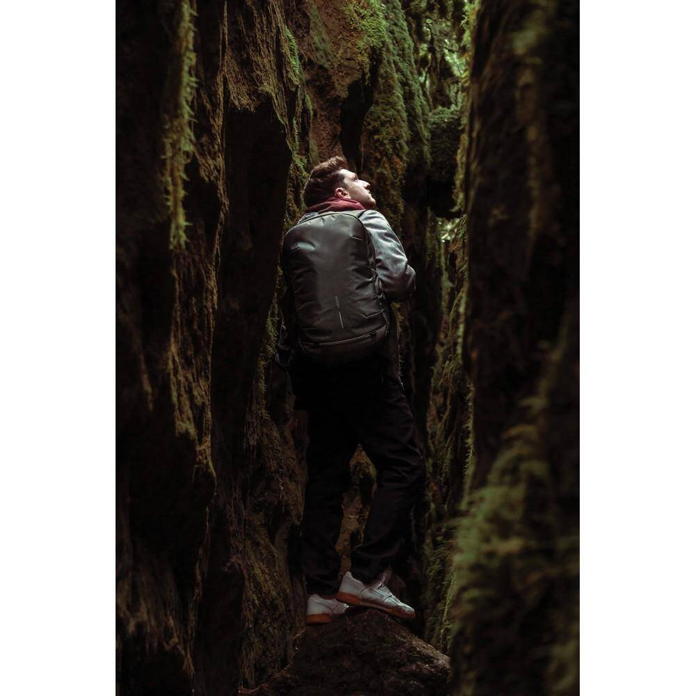 Plecak chroniący przed kieszonkowcami Bobby Explore, przestronna, rozszerzalna przegroda główna, kieszenie z ochroną RFID, kieszeń szybkiego dostępu u góry, miękkie i regulowane paski na ramiona, wykonany z RPET dzięki czemu zaoszczędzonych zostało 54 litry wody i zostało ponownie wykorzystanych 91 plastikowych butelek PET, dzięki zastosowaniu technologii śledzącej AWARE™ wykorzystane włókna są identyfikowalne z pochodzenia oraz wyprodukowane zostały zgodnie z ideą zrównoważonego rozwoju
