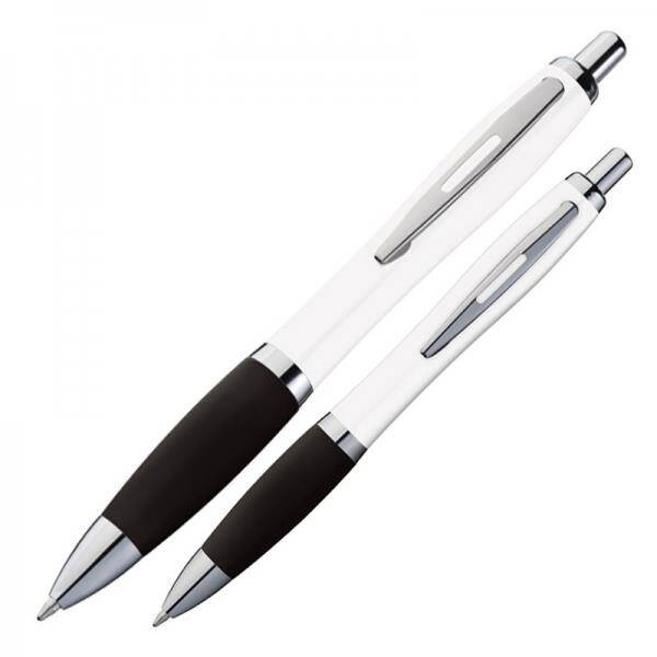 Plastikowy długopis z białym korpusem i kolorową gumką ułatwiającą trzymanie. Wyposażony w metalowy klips i duży wkład piszący na niebiesko. Długopis dostępny w bogatej gamie kolorystycznej.