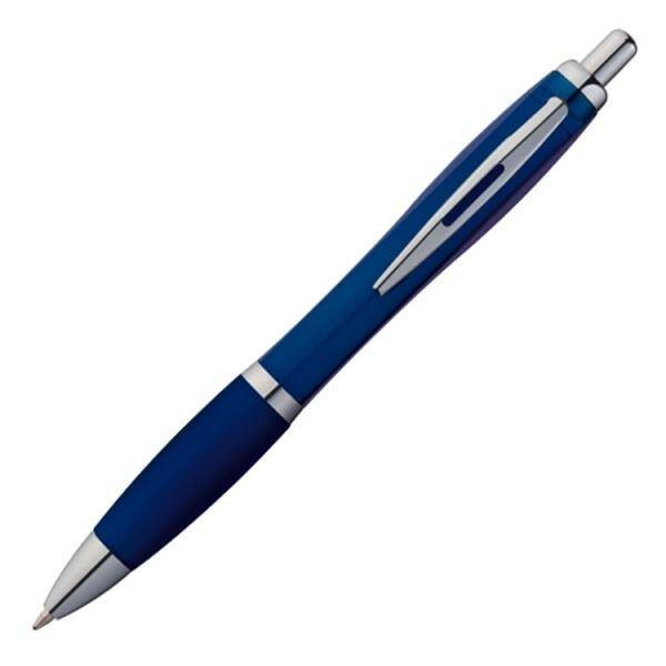 Długopis plastikowy z antypoślizgową gumką oraz z błyszczącymi elementami. Wyposażony w system typu kilk oraz wkład w kolorze niebieskim. Długopis dostępny w bogatej gamie kolorystycznej.