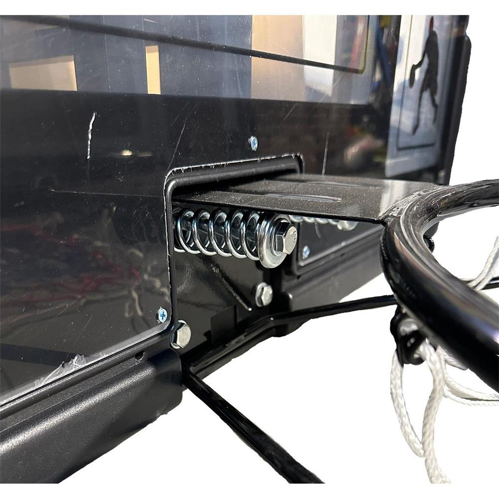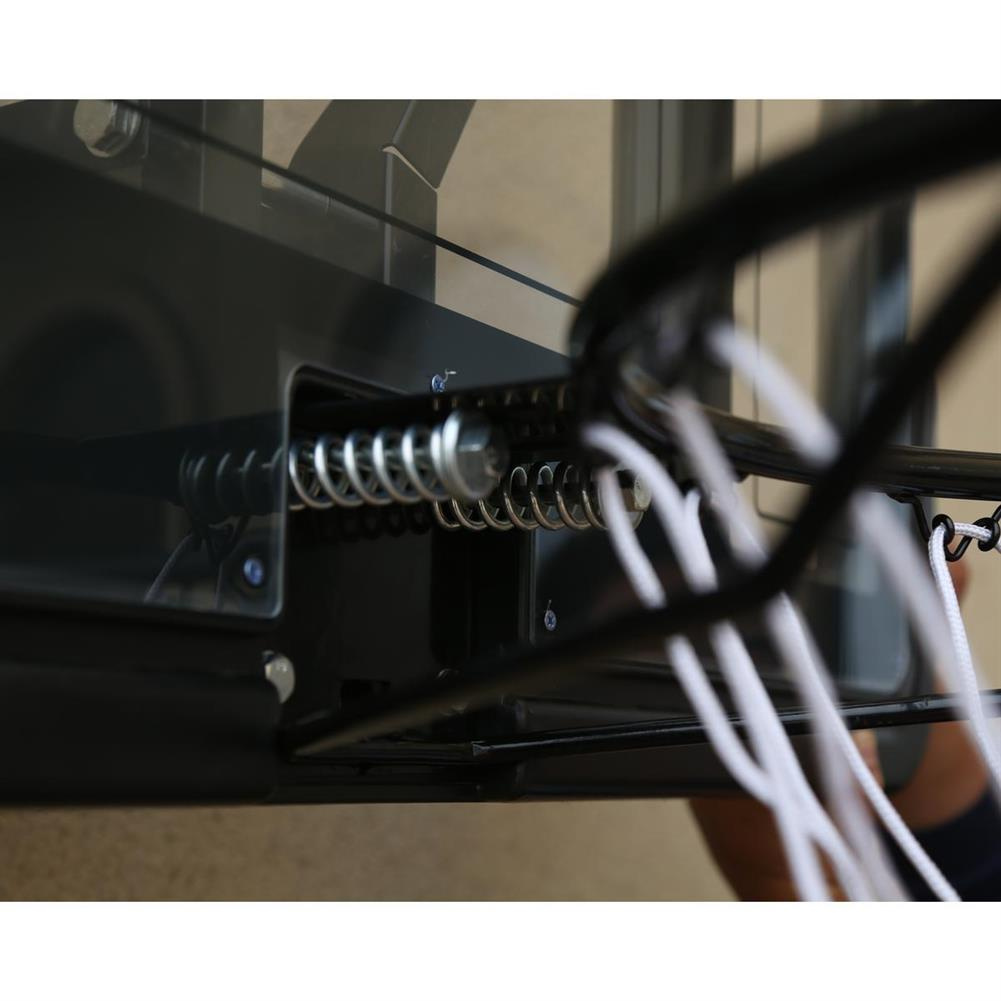 Obręcz do kosza została dodatkowo wyposażona w sprężyny amortyzujące –mechanizm uchylny, gwarantujący bezpieczną grę i wysoki komfort oraz jakość gry. Działanie sprężyn polega na efektywnym absorbowaniu energii uderzenia podczas rzutu piłki do kosza, co redukuje naprężenia wywołane mocnymi rzutami.
