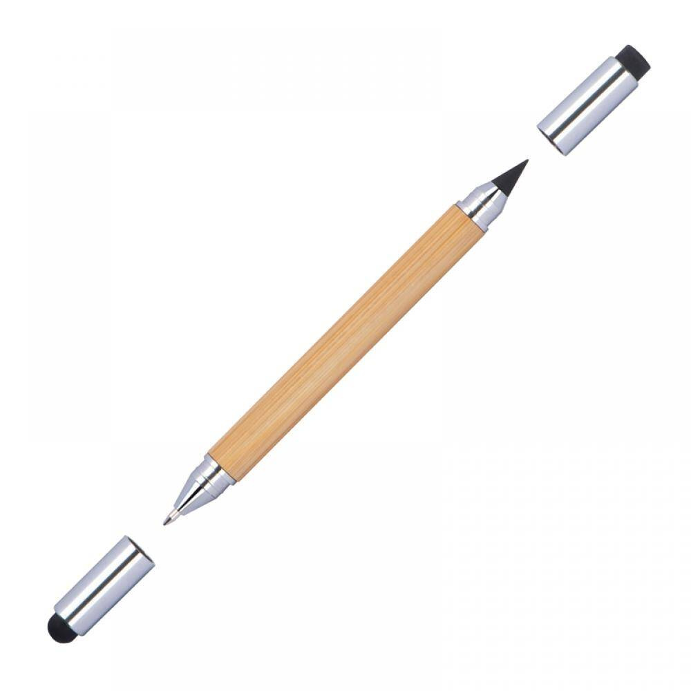 Przyrząd do pisania 2 w 1, jeden koniec to długopis z niebieskim wkładem oraz zatyczką z touchpenem, z drugiej strony znajduje się wieczny ołówek z zatyczką z gumką do mazania.