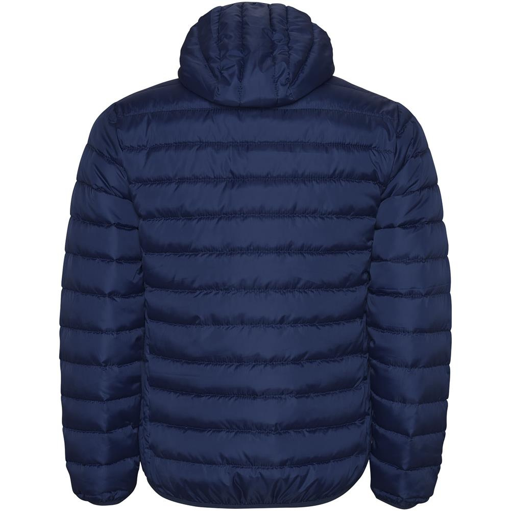 Męska pikowana kurtka z dopasowanym kapturem z materiału przypominającego w dotyku pierze. Odwrócone zamki błyskawiczne z dopasowaną osłoną podbródka. Dwie przednie kieszenie zapinane na zamek. Dopasowane elastyczne wykończenia mankietów, dołu i kaptura. Kontrastowa wewnętrzna podszewka. Dołączona torba transportowa. Lekka i składana odzież. Wodoodporna. Model wiatroszczelny.