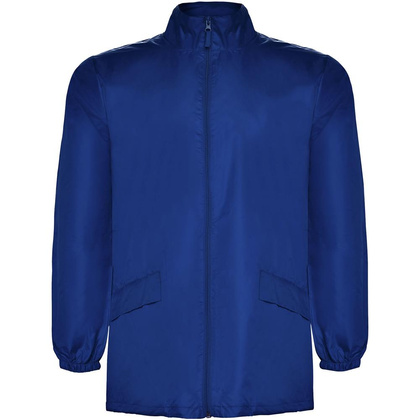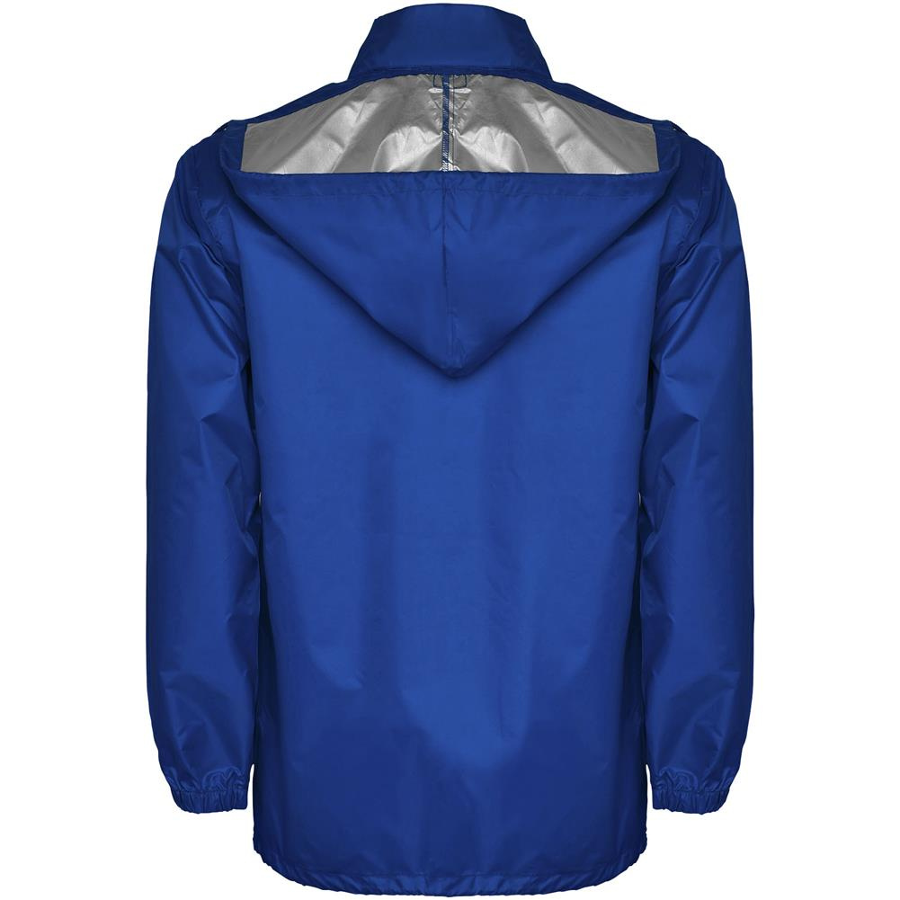 Wodoodporny płaszcz przeciwdeszczowy. Wysoki kołnierz i składany kaptur z regulowanym sznurkiem. Zamek błyskawiczny z przodu z dopasowanym ściągaczem. Dwie boczne kieszenie z klapką. Elastyczne mankiety. Elastyczny pasek wewnątrz kieszeni do składania i przechowywania. Model wodoodporny.
