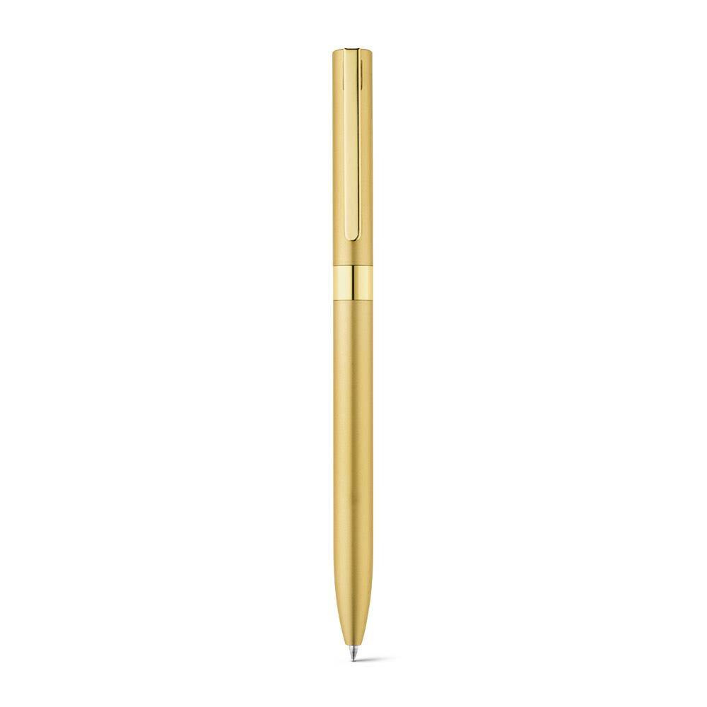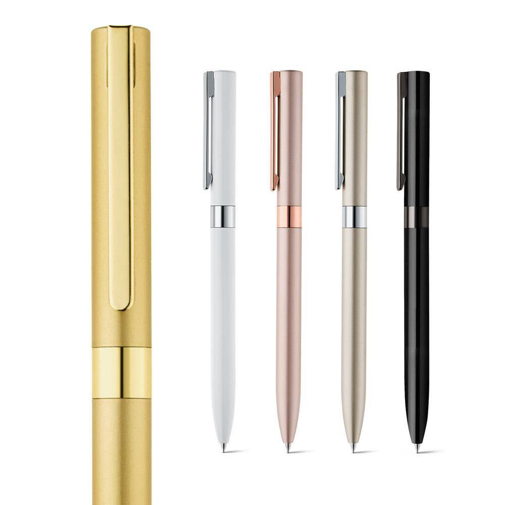 Aluminiowy długopis z mechanizmem obrotowym i klipsem.