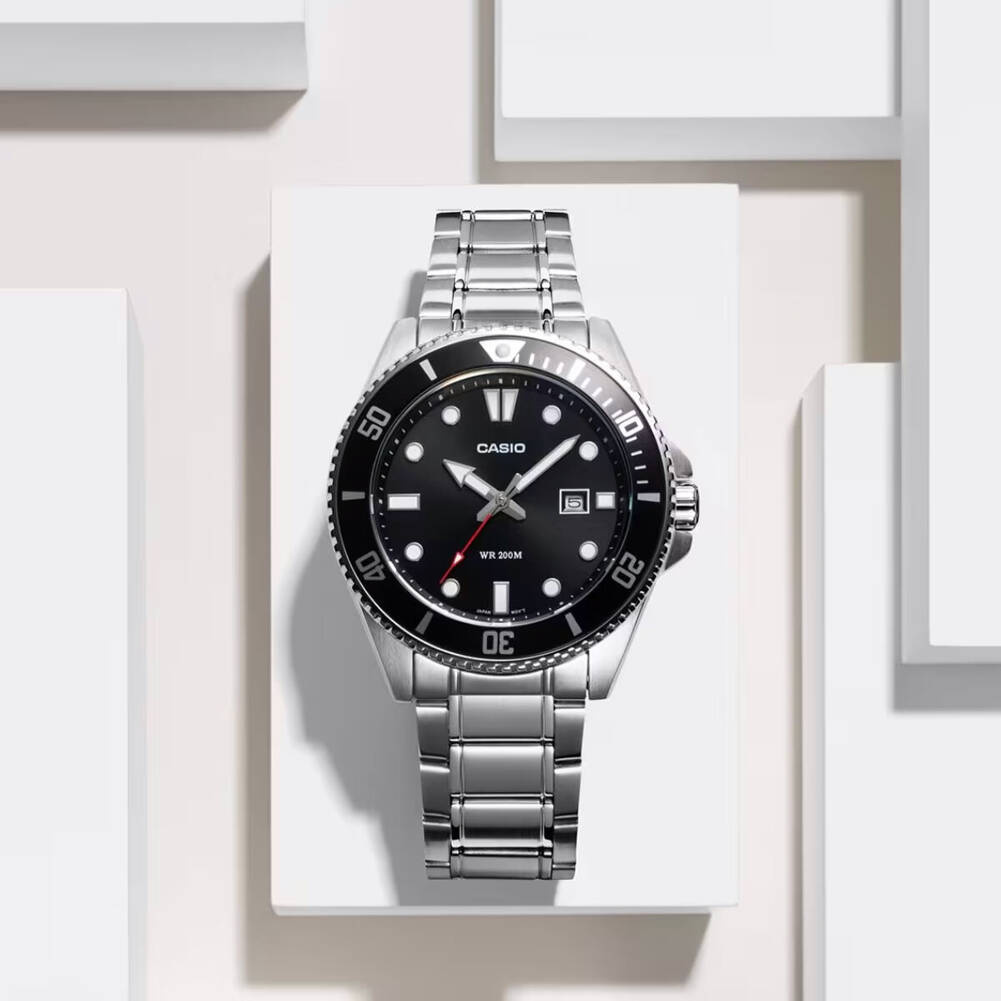 - Zegarek Casio MDV-107D-1A1 to sportowy zegarek, zaprojektowany z myślą o nurkowaniu bez sprzętu. Solidna stalowa koperta z obrotowym ringiem jest idealna dla aktywnych osób. Bransoleta wykonana również ze stali szlachetnej zapewnia niezawodność oraz komfort użytkowania. Na czarnej tarczy wskazują białe, fosforyzowane indeksy, a datownik umieszczony przy godzinie 3 ułatwia odczyt aktualnego dnia miesiąca. Ważne jest, aby zachować wysoką klasę wodoszczelności 200M, dokręcając koronkę do końca przed każdym użytkowaniem.