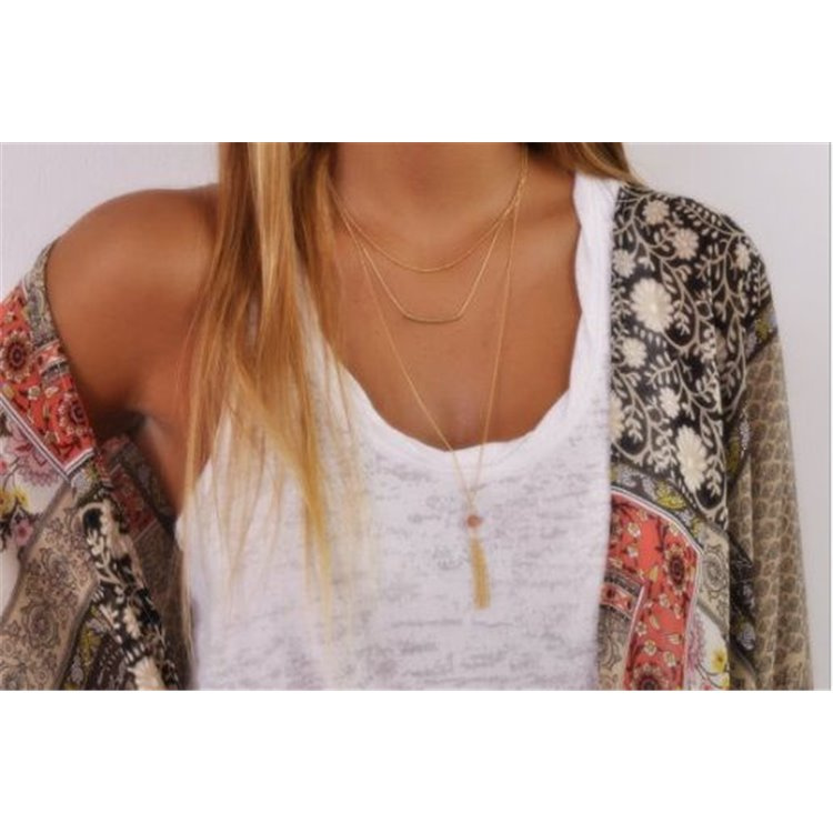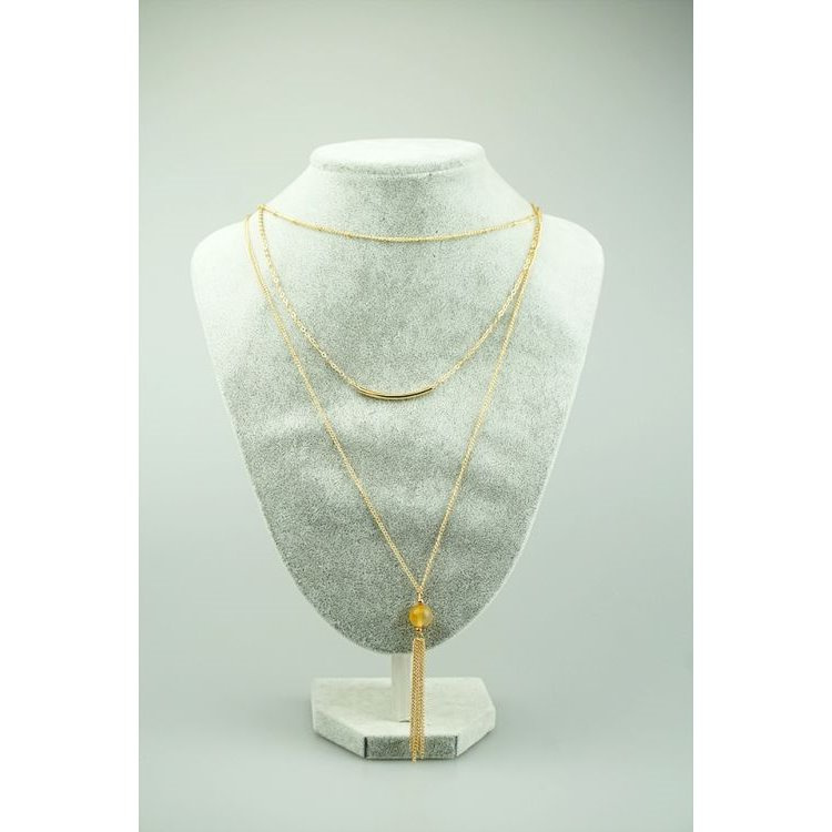 Potrójny naszyjnik w kolorze złotym, zdobiony koralikiem z wiszącymi łańcuszkami.Świetnie pasuje do eleganckich, jak również do  codziennych stylizacji.W naszym naszyjniku każda kobieta poczuje się wyjątkowo i pięknie :)Wymiary:długość łańcuszka 45 cm (maksymalna) regulacja 5 cm długośc elementu wiszącego 7 cm