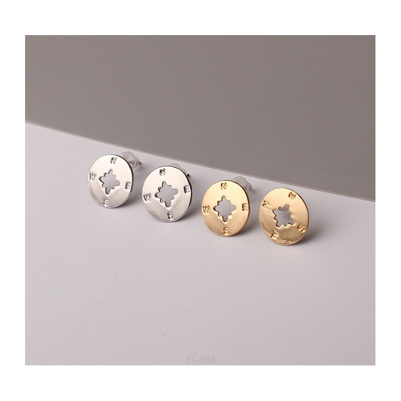 Piękne, delikatne kolczyki w dwóch kolorach do wyboru: złotym i srebrnym.Bardzo modne i efektowne. Będą stanowić piękne uzupełnienie eleganckiej kreacji jak i codziennego stroju. Wykonane ze stopów metali nieszlachetnych.Nie są odporne na wodę.Biżuteria antyalergiczna, nie zawiera niklu ani chromu. Wymiary: średnica 1,3 cm