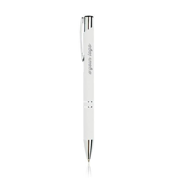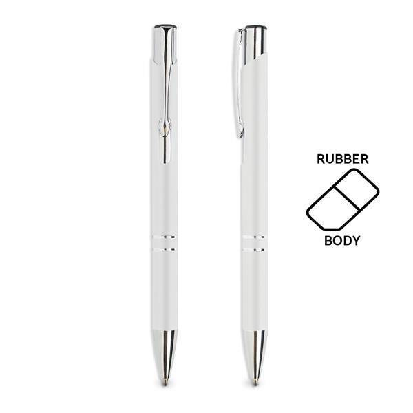 Długopis aluminiowy z gumowaną powierzchnią, soft touch oraz z mechanizmem wciskanym.
