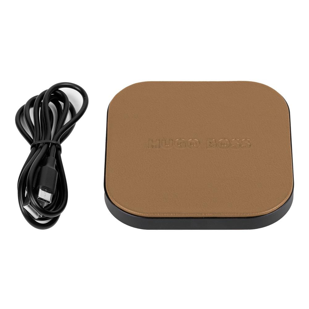 Ta ładowarka o kwadratowym designie ma aluminiowe wykończenie z eleganckimi, okrągłymi narożnikami i subtelnym logo Hugo Boss.
