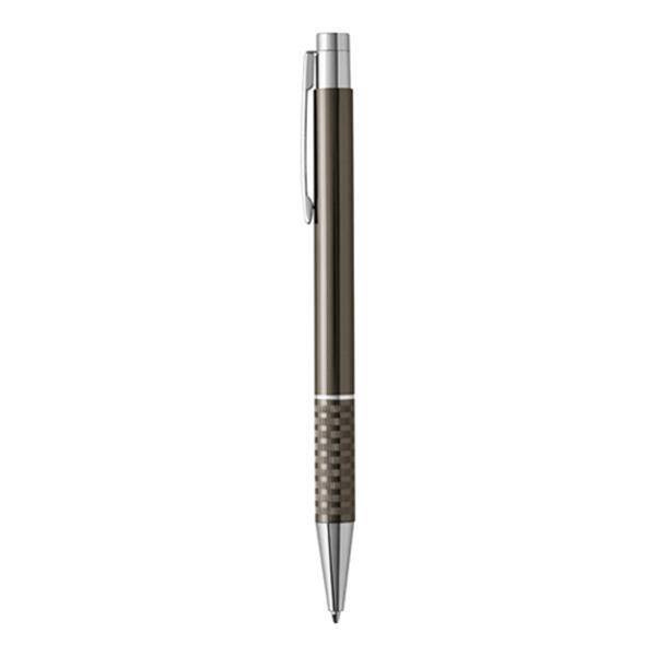 Metalowy długopis z elementami w srebrnym kolorze, z mechanizmem wciskanym, pisze na czarno.