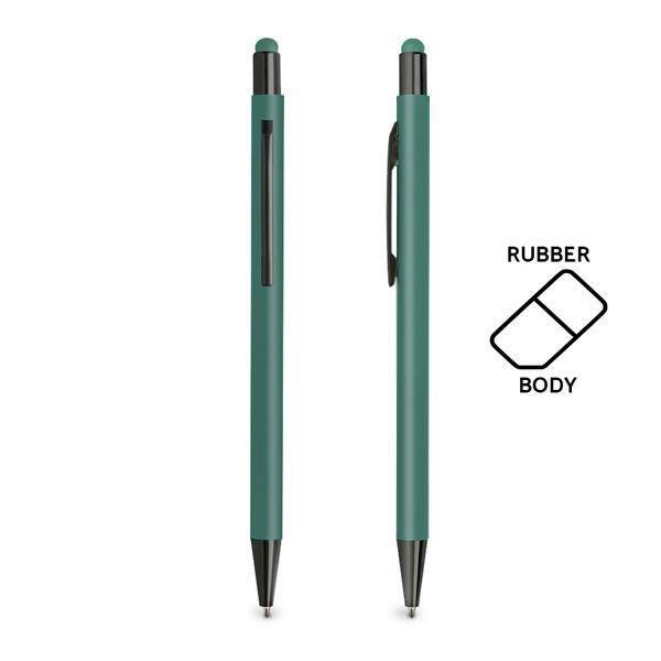 Długopis aluminiowy z gumką do obsługi ekranów dotykowych i gumowaną powierzchnią, z mechanizmem wciskanym, pisze na niebiesko.