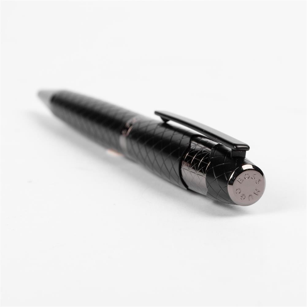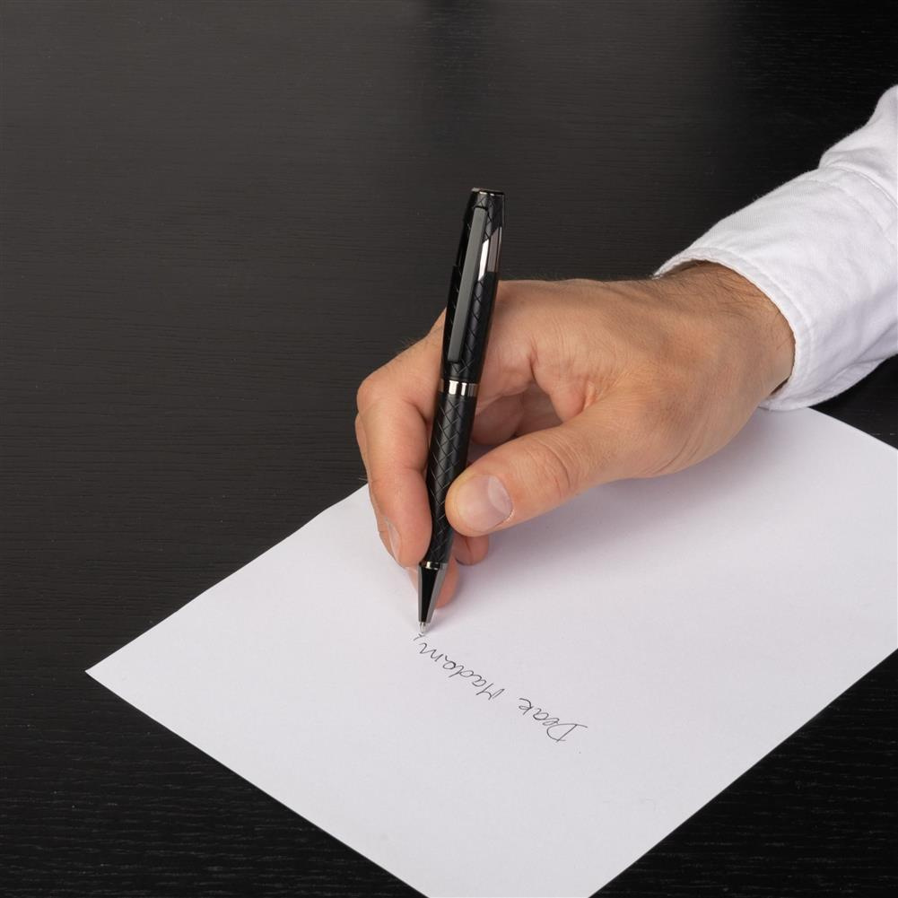 Linia Chevron to współczesna interpretacja ponadczasowego elementu garderoby, inspirowana klasycznym wzorem w jodełkę, charakterystycznym wzorem naszych gotowych ubrań. Dzięki innowacyjnej grze faktur, powstał odważnie nowoczesny przyrząd do pisania. Ta wersja, z czarną, matową, plecioną fakturą i pistoletowymi wykończeniami jest prawdziwą deklaracją luksusu.