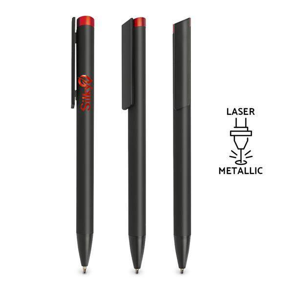 Czarny długopis z mechanizmem wciskanym z gumową, antypoślizgową powłoką, soft touch i kolorową końcówką.