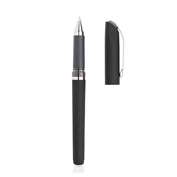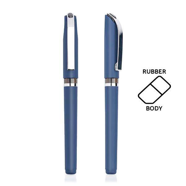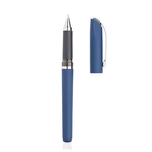 Plastikowy długopis z elementami w srebrnym kolorze.