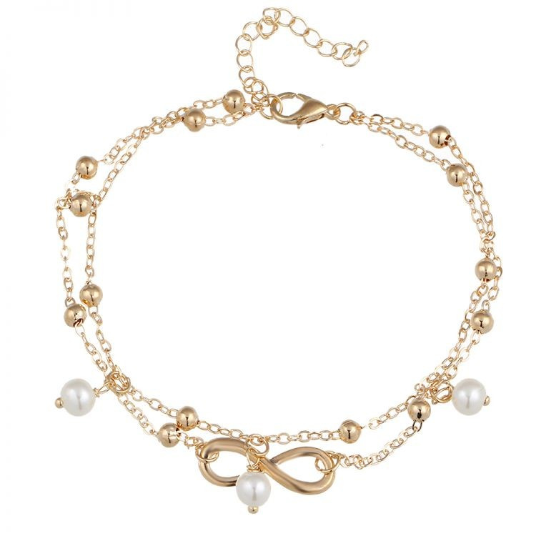 Delikatna i efektowna bransoletka na stopę z symbolem infinity oraz perełkami i kuleczkami.