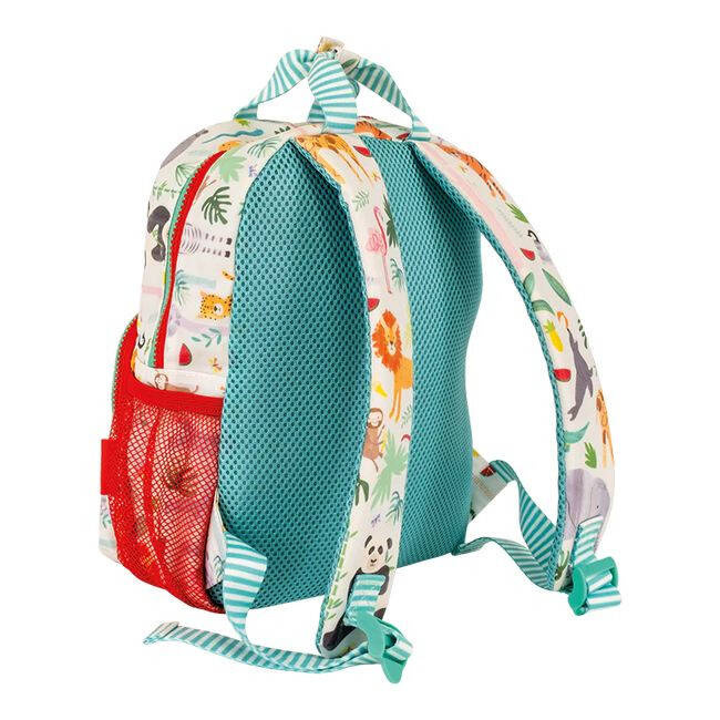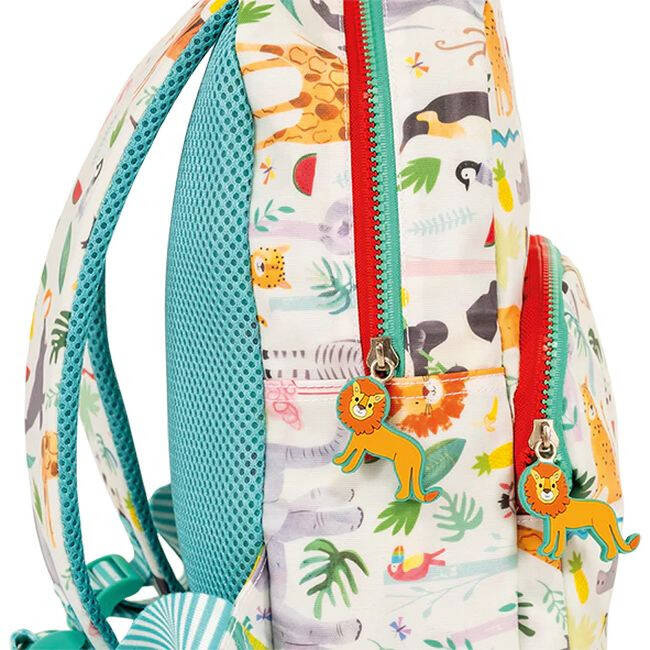 Doskonały dla poszukiwaczy przygód i odkrywców, plecak z motywem gzotycznych zwięrząt! Niezależnie od tego, czy maluch zmierza do szkoły, wyrusza na wakacje, czy idzie na dodatkowe zajęcia, ten plecak ma idealny rozmiar, aby bezpiecznie pomieścić wszystkie jego rzeczy. Plecak posiada pojemną komorę główną i przednią kieszeń, obie zamykane na wygodne suwaki z breloczkami w kształcie lwa. Ponadto, ma wyściełane, regulowane szelki, boczną kieszeń na butelkę z napojem oraz wygodny górny uchwyt do przenoszenia i zawieszenia.