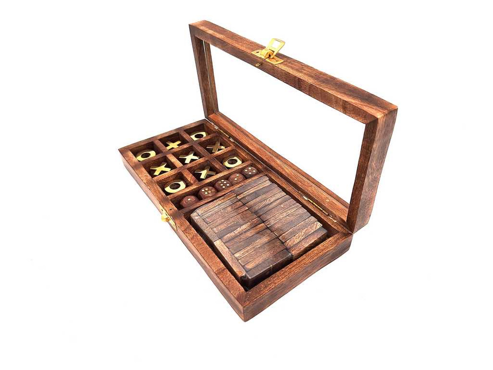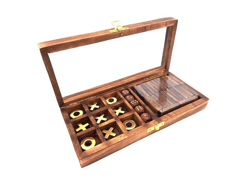Zestaw gier - domino, kości, kółko i krzyżyk Informacje o produkcie: • Wymiary: 25 x 25 x 7,5 cm • Materiał: drewno, mosiądz, szkło • Eleganckie pudełko ze szklanym