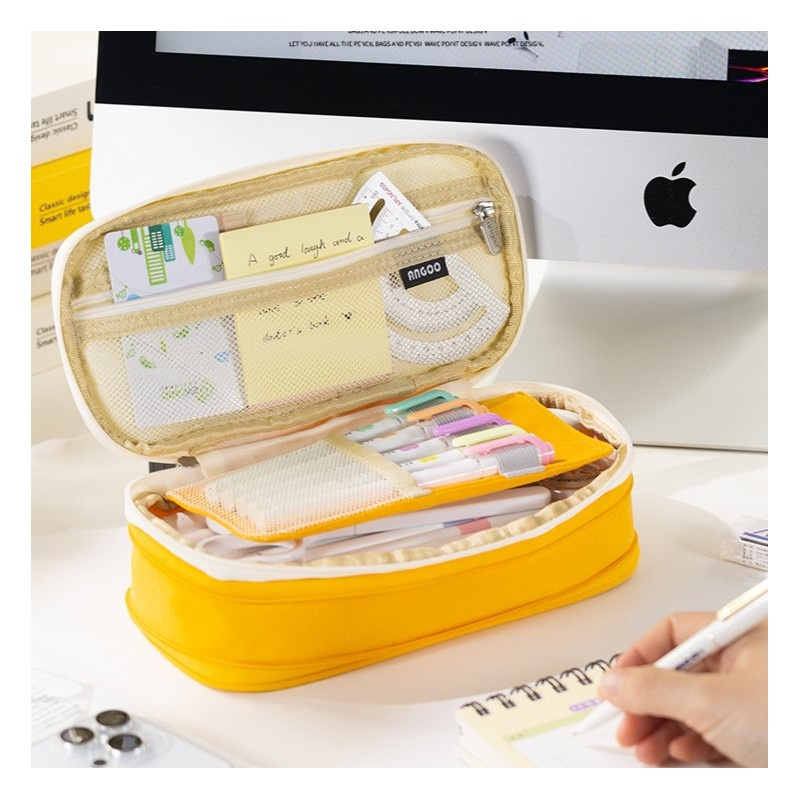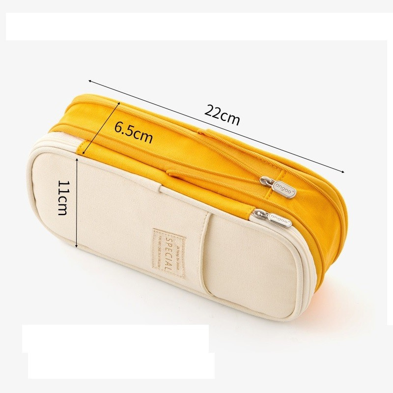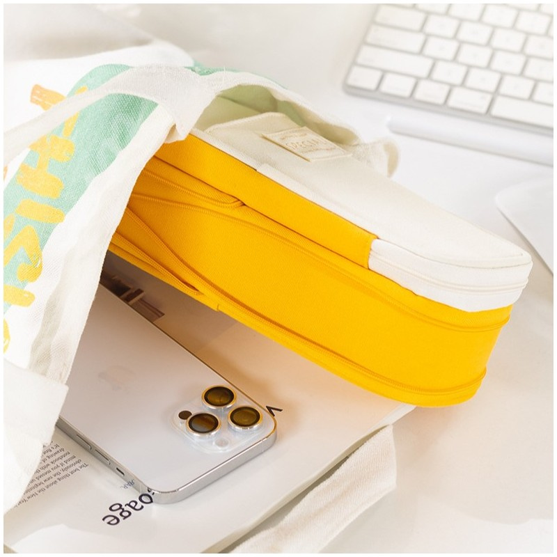DUŻY PIÓRNIK WIELOFUNKCYJNY SASZETKA TRZYKOMOROWY Wykonany z wysokiej jakości materiałów. Ergonomiczne wykorzystanie przestrzeni. Specyfikacje: Kolor: kremowo-żółty Materiał: 100% poliester Wymiary: 22 cm  x 6,5 cm x 11 cm Waga: 120g