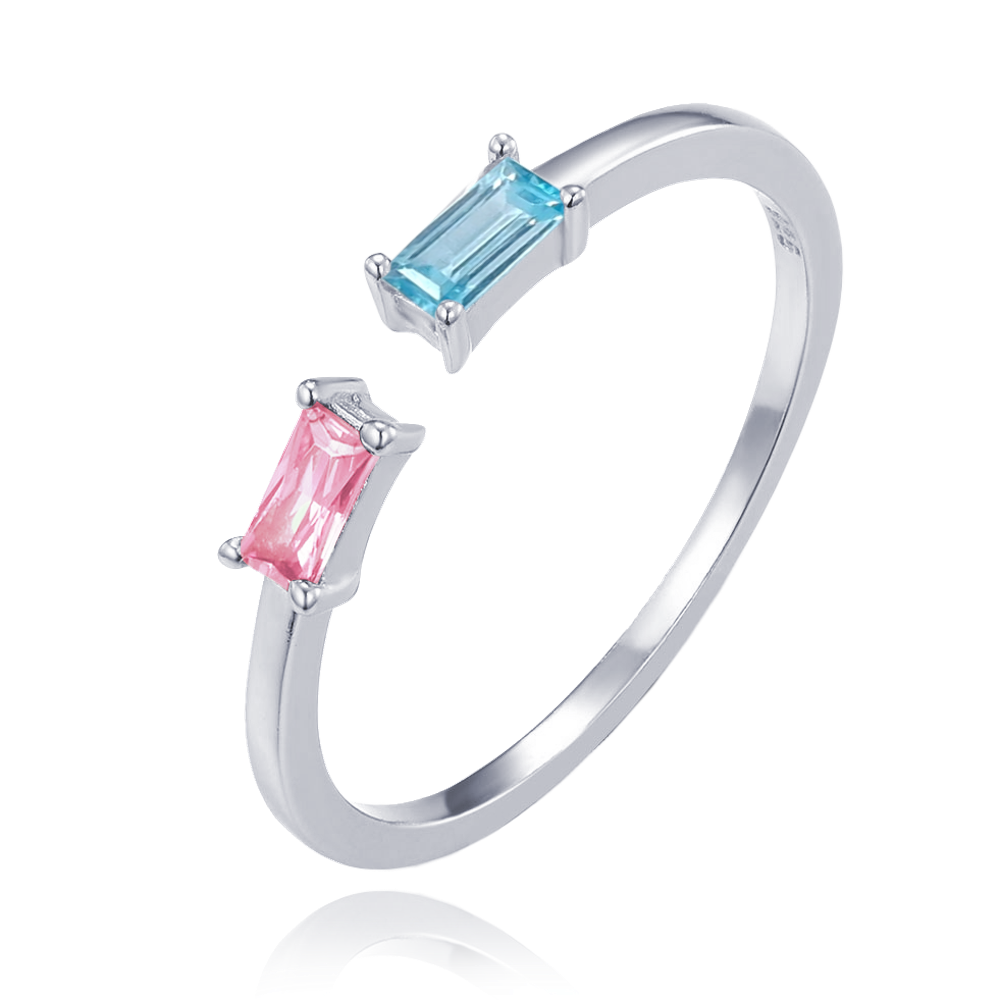 Ten popularny srebrny pierścionek z różowym i niebieską cyrkonią sześcienną jest jednym z najlepiej sprzedających się pierścionków MINET.