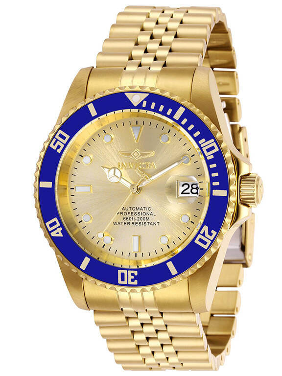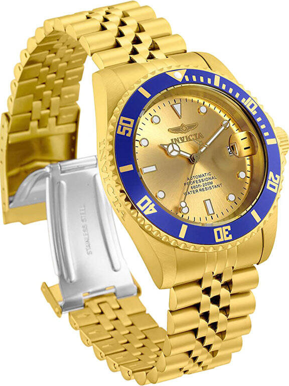 Zegarek męski Invicta Pro Diver Professional Automatic 29184 to idealny zegarek o eleganckim i stylowym charakterze i świetnymi parametrami technicznymi. Jest to zegarek do nurkowania wykonany z wysokiej jakości stali szlachetnej, pokrytej złotą powłoką. Urządzenie napędzane jest japońskim, automatycznym mechanizmem Seiko NH35A, z rezerwą chodu 41h. Szkło mineralne chroni przed drobnymi zarysowaniami i obtłuczeniami zegarka. Indeks oraz wskazówki posiadają powłokę luminescencyjną Trinite zakręcana koronka dodatkowo chroni przed wodą Wodoszczelność zegarka to 200 metrów, dzięki czemu nie trzeba go zdejmować do pływania ani nurkowania na większe głębokości.