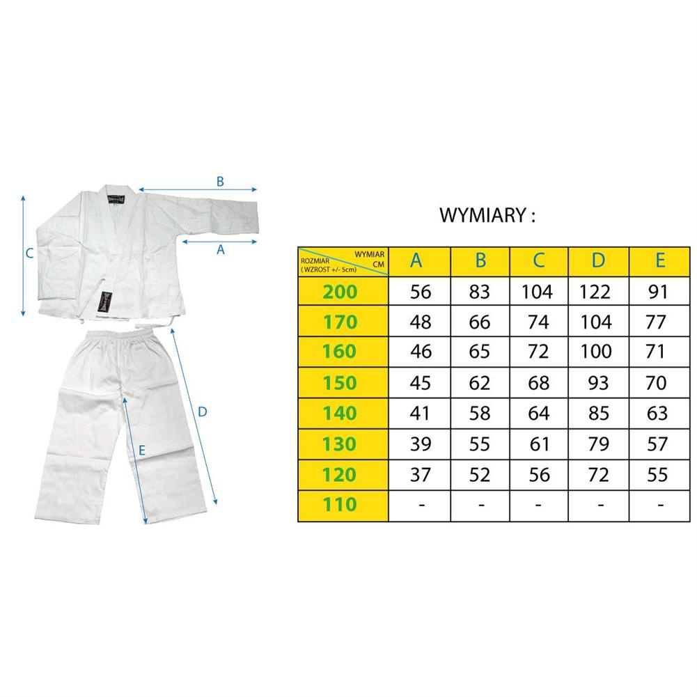 Klasyczne białe kimono karate wyróżnia się trwałością i odpornością na uszkodzenia. Strój uszyto w 100% z bawełny w oparciu o tradycyjny, uniwersalny fason. Bluza ma wzmocniony kołnierzyk, spodnie posiadają wszytą gumkę oraz sznurek do wiązania, dzieki temu zyskujesz wygodę i idealne dopasowanie. W zestawie otzrymasz także biały pas.