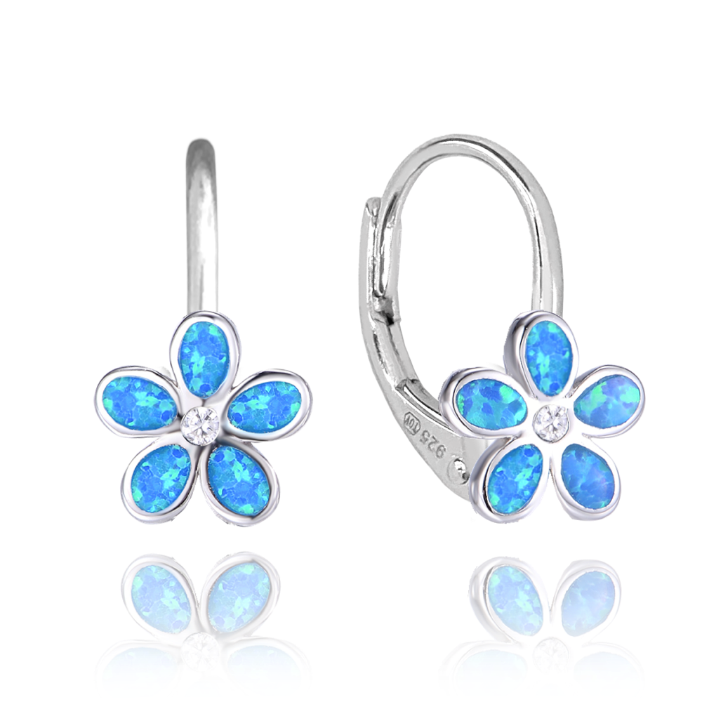 MINET Kolczyki błyszczące srebrne KWIATY z granatowymi opalami i cyrkonią