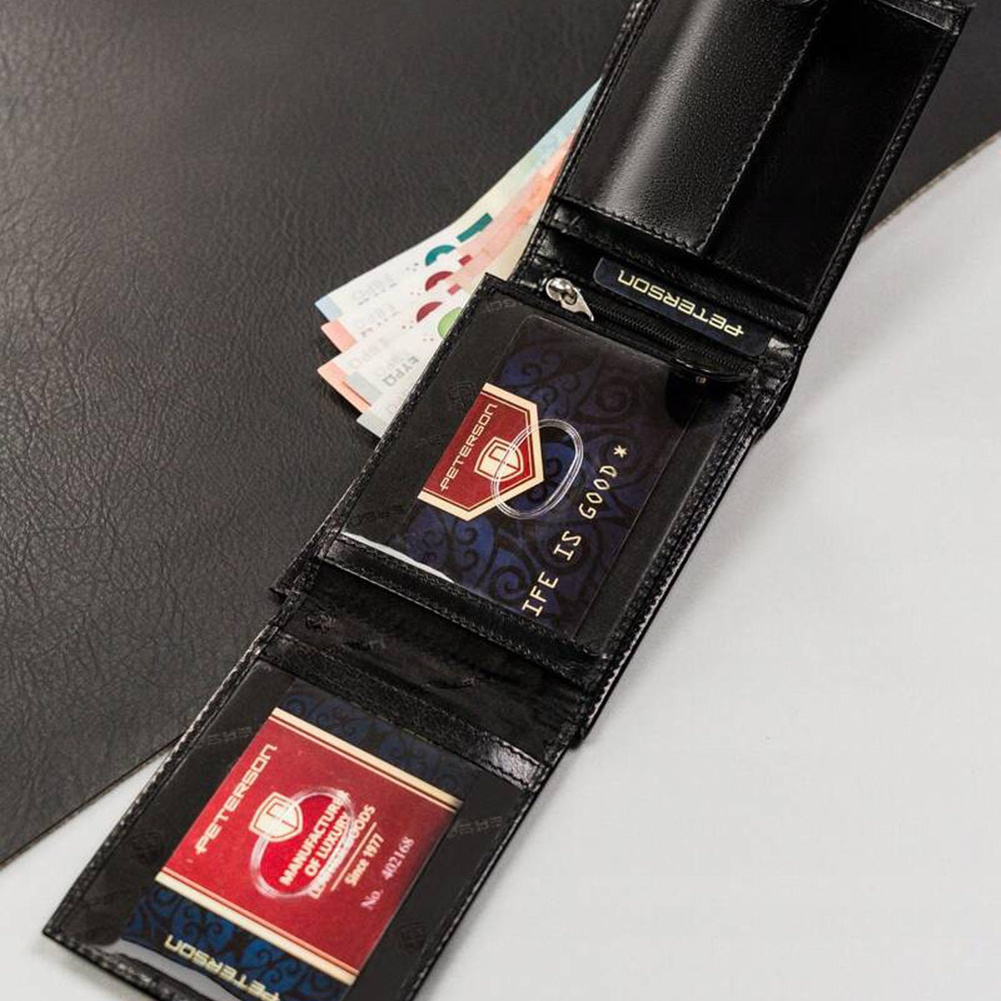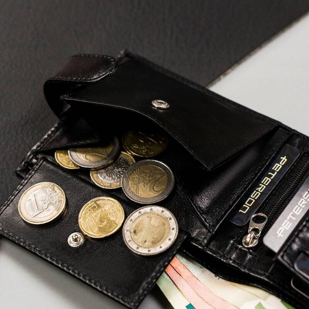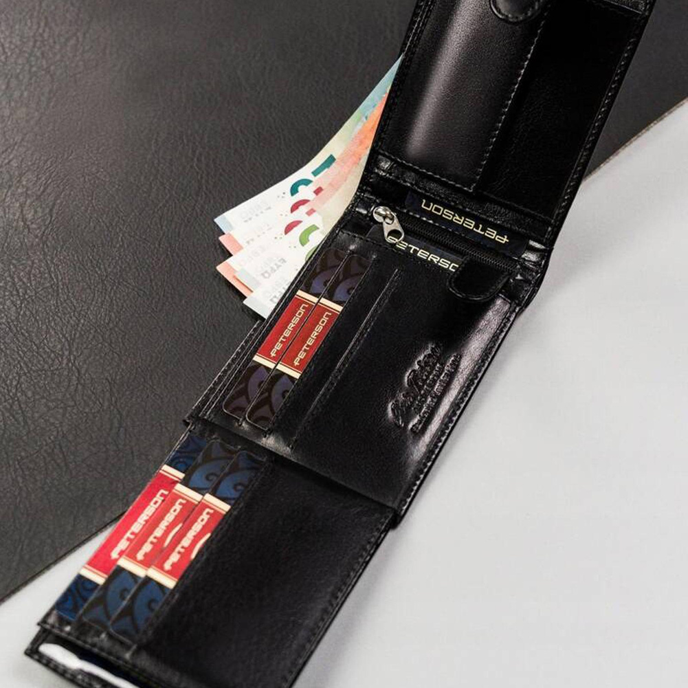 Portfel Peterson charakteryzuje się rozbudowaną funkcjonalnością. Posiada dwie komory, które oferują dużo miejsca na przechowywanie banknotów oraz innych dokumentów. 14 przegródek na karty pozwala na wygodne uporządkowanie kart płatniczych, identyfikacyjnych czy lojalnościowych. Dodatkowe przezroczyste przegrody umożliwiają szybki dostęp do najważniejszych dokumentów, takich jak dowód osobisty czy prawo jazdy. Kieszenie na monety zamykane są zarówno na suwak, jak i na zatrzask, co zapewnia dodatkowe bezpieczeństwo dla bilonu.