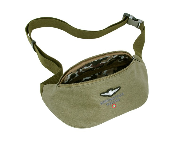 Saszetka biodrowa, nerka, przewieszka, jednokomorowa, zamykana na suwak; z regulowanym paskiem z klipem na biodra; włoskiej firmy Aeronautica Militare, wykonana ze specjalnej gumowanej tkaniny technicznej o podwyższonych parametrach odporności na codzienne użytkowanie , w kolorze zielonym nero.