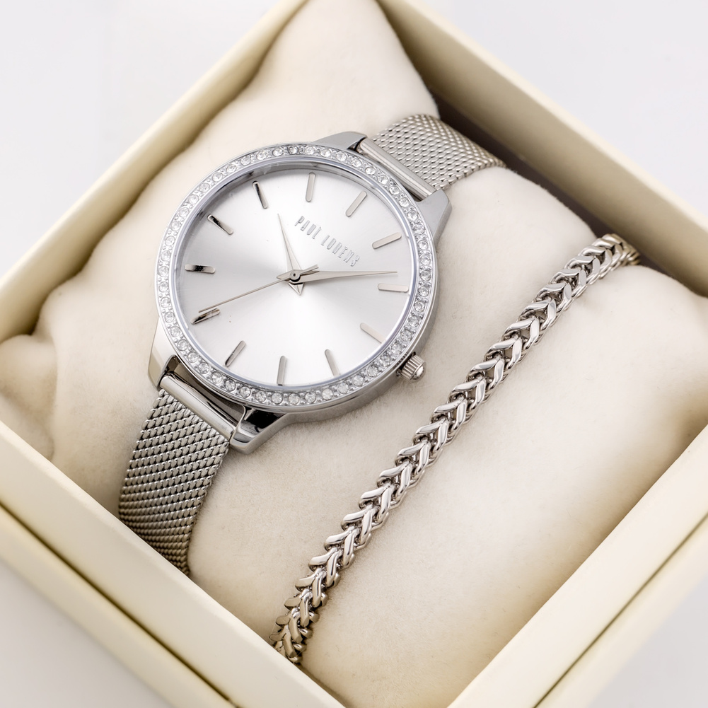 Komplet prezentowy damski, który zachwyca swoją elegancją i ponadczasowym stylem. Zawiera zegarek ze stali szlachetnej marki Paul Lorens w kolorze srebrnym, z piękną tarczą w tym samym kolorze, która subtelnie podkreśla jego klasyczny charakter. Srebrna koperta zegarka zdobiona kryształkami, dodaje całości wyjątkowego blasku. Zegarek charakteryzuje się także wodoszczelnością WR30, co sprawia, że jest praktyczny i funkcjonalny. Do kompletu dołączona jest elegancka bransoletka w kolorze srebrnym, która perfekcyjnie komponuje się z zegarkiem. To idealny wybór na prezent – elegancki, piękny i niezapomniany.
