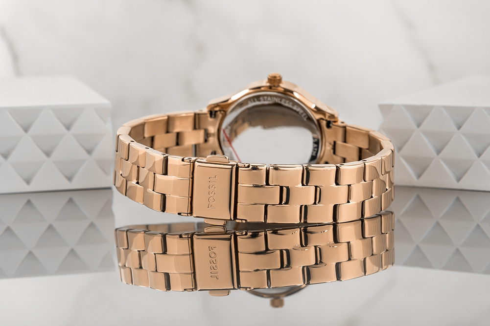 Odkryj jak segmentowana bransoleta zegarka w kolorze różowego złota może dodać czaru Twoim codziennym stylizacjom! Jej subtelna konstrukcja emanuje elegancją, wprowadzając finezję, która przyciąga spojrzenia. Wykonanie z wysokiej jakości stali nierdzewnej sprawia, że nie tylko zachwyca wyglądem, ale także zapewnia trwałość i komfort noszenia. Zmysłowy charakter tej bransolety sprawia, że doskonale układa się na kobiecym nadgarstku, delikatnie go oplatając i podkreślając jego kobiecość. Całość dopełnia subtelne logo FOSSIL na zapięciu bransolety, które stanowi ekskluzywny akcent.
