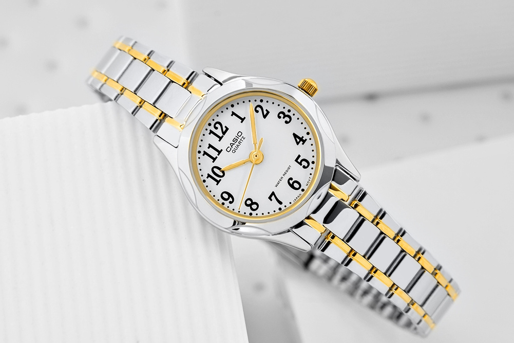 Ten model zegarka CASIO to idealny wybór dla kobiet o drobnej, delikatnej dłoni, subtelnie podkreślający jej smukłość i elegancję. Dzięki kompaktowej kopercie i lekkiej konstrukcji, nosi się go niemal jak biżuterię – jest wygodny, stylowy i niezwykle ponadczasowy. To doskonały prezent na Komunię Świętą – jego klasyczny design sprawia, że będzie pasował zarówno do młodej damy, jak i kobiety, która ceni sobie subtelną elegancję. Minimalistyczna tarcza w klasycznym białym kolorze z czytelnymi czarnymi cyframi zapewnia maksymalną przejrzystość, a srebrno-złote wykończenie dodaje mu luksusowego charakteru.