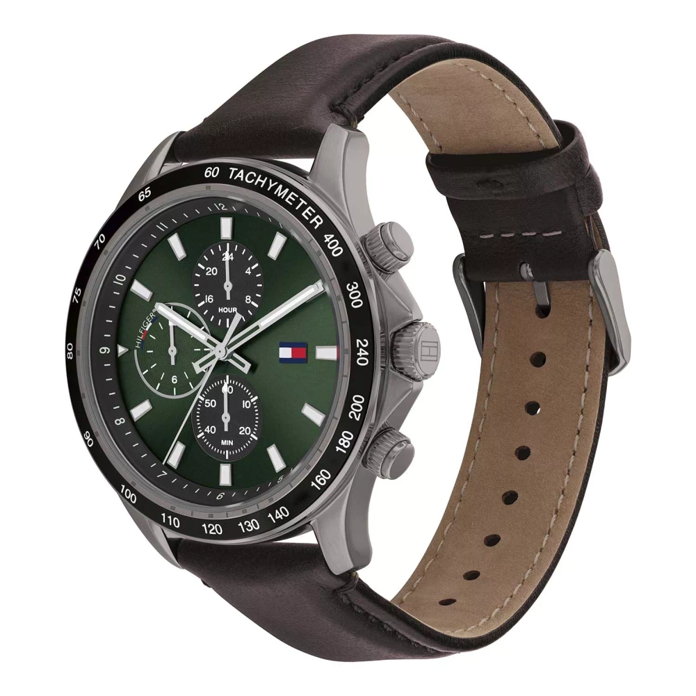 Zegarek męski TOMMY HILFIGER 1792017 Miles to elegancki model, który łączy nowoczesny design z funkcjonalnością. Posiada szarą kopertę wykonaną ze stali szlachetnej, co zapewnia wysoką trwałość oraz elegancki wygląd. Pasek zegarka wykonany jest ze skóry naturalnej w kolorze brązowym. Jego zielona tarcza wyróżnia się klasycznym, ale zarazem nowoczesnym stylem, doskonale kontrastując z metalowymi detalami. Zegarek oferuje dwóch strefy czasowe, co czyni go idealnym rozwiązaniem dla podróżników, a także umożliwia jednoczesne śledzenie czasu w różnych częściach świata.