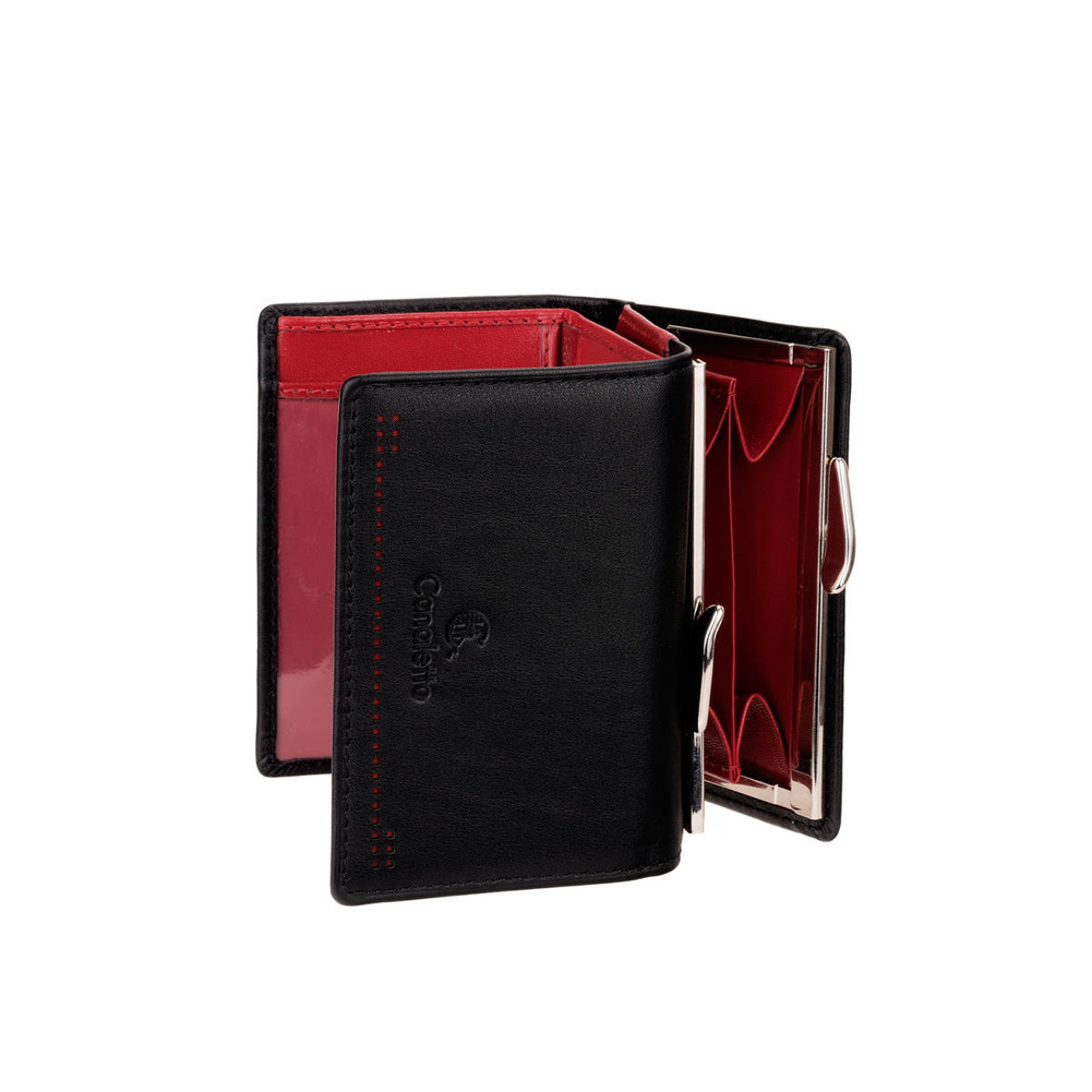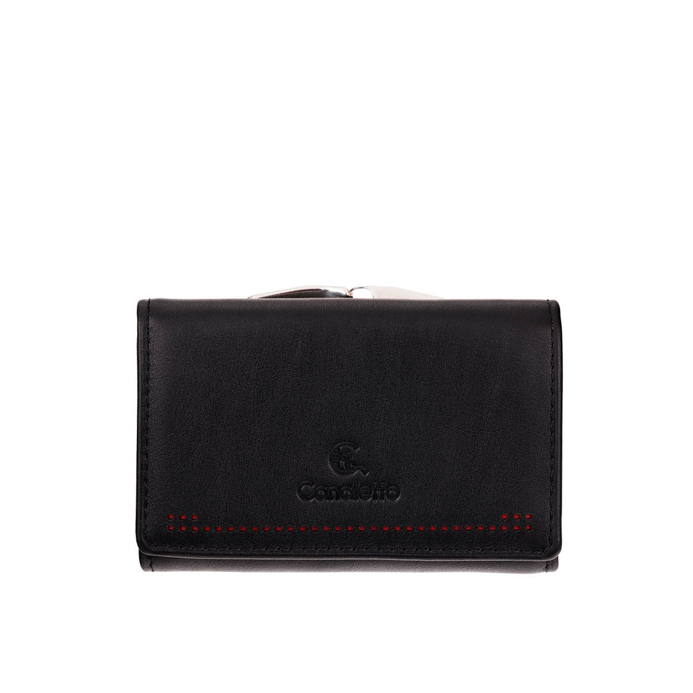 - Stylowy czarny portfel damski Canaletto z perforacją laserową. 6 przegródek na karty, okienko na zdjęcie, podwójna kieszeń na drobne zapinana na bigiel, przegroda na banknoty. Polska produkcja, skóra naturalna.