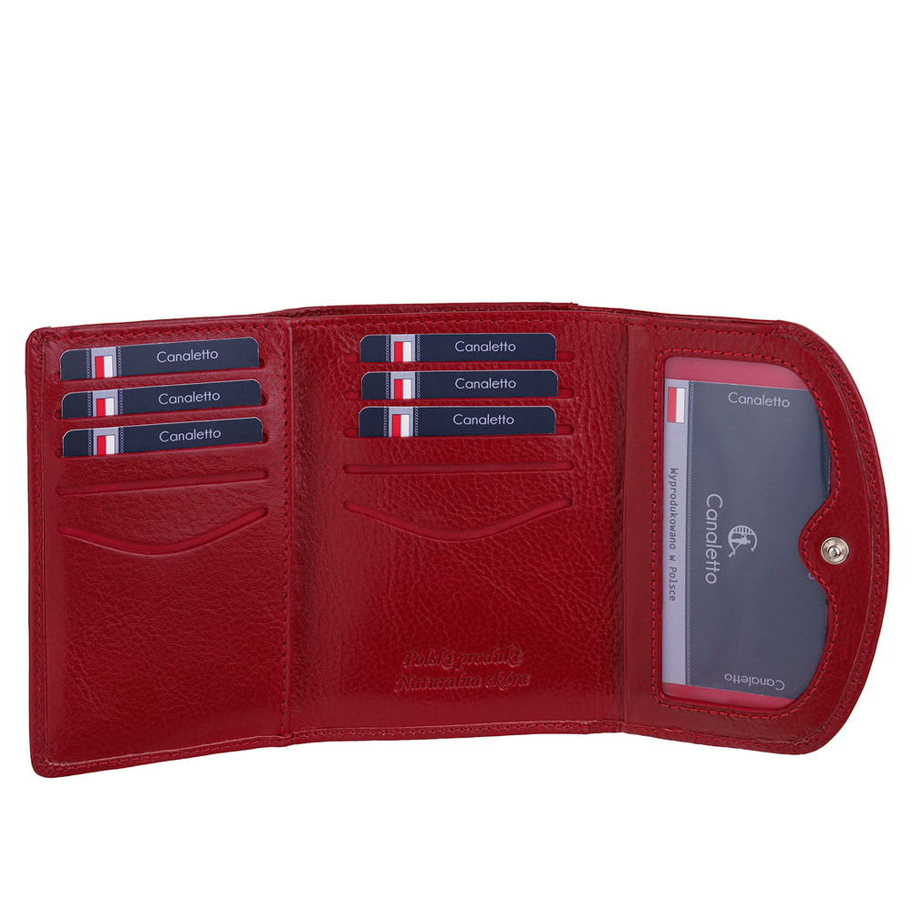 - Stylowy czerwony portfel damski Canaletto z naturalnej skóry licowej. 11 przegródek na karty, kieszeń na banknoty, praktyczna kieszonka na drobne i tłoczone logo. Polski produkt o najwyższej jakości wykonania.