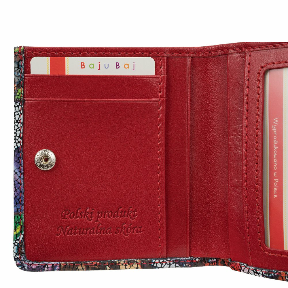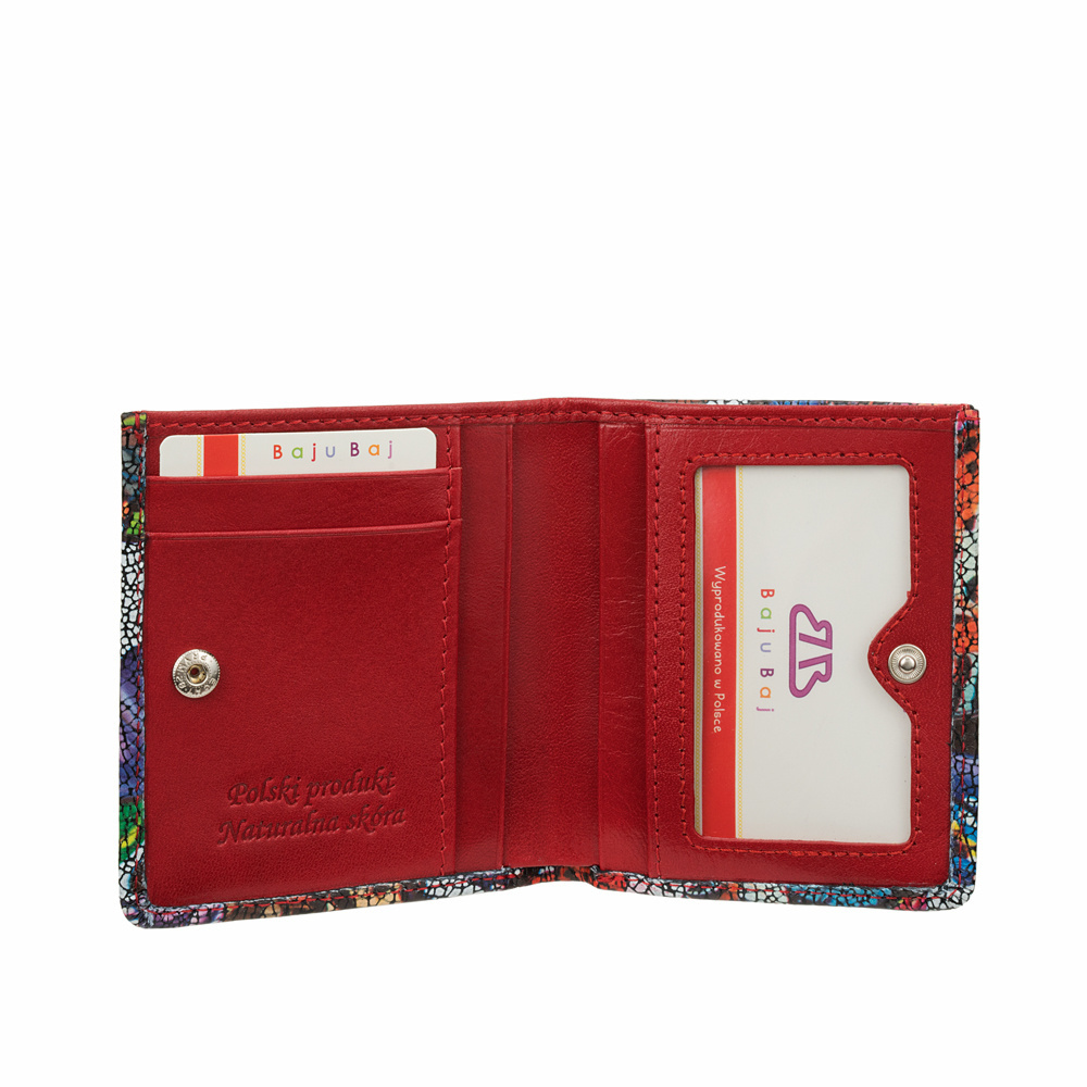 - Stylowy portfel damski BajuBaj z naturalnej kolorowej skóry. Około 6 miejsc na karty, kieszeń na banknoty, oryginalna kieszonka na drobne i bezpieczne zapięcie. Polski produkt najwyższej jakości!