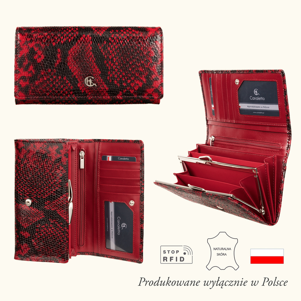 - Stylowy portfel damski Canaletto ze skóry naturalnej o wzorze węża z technologią RFID. 6 przegródek na karty, podwójna kieszeń na monety, przegroda na banknoty i skrytka na suwak. Polska jakość i precyzja!