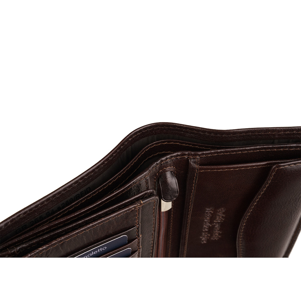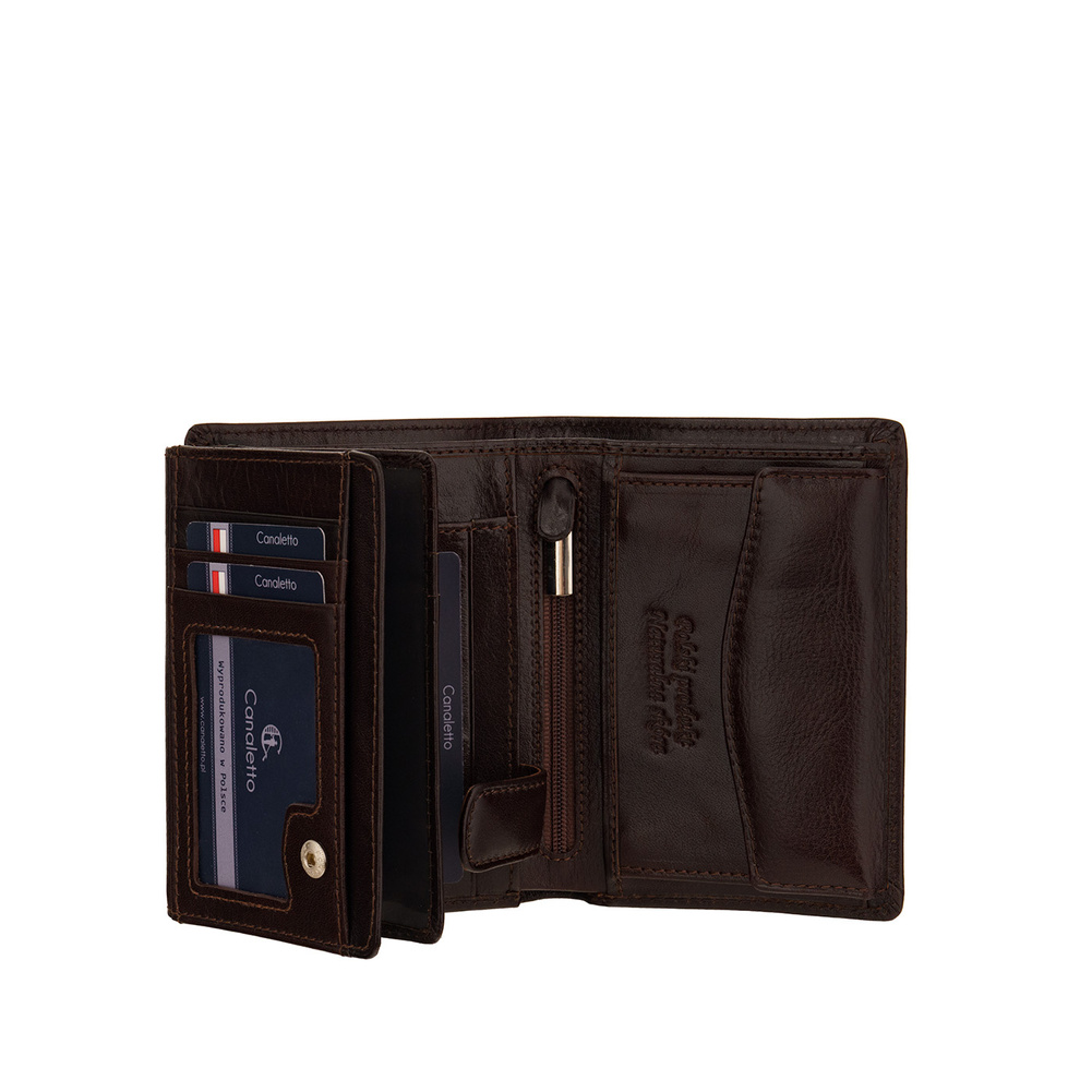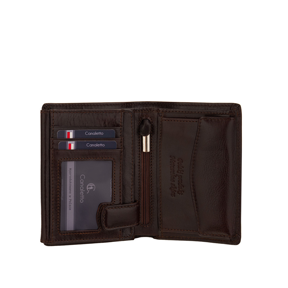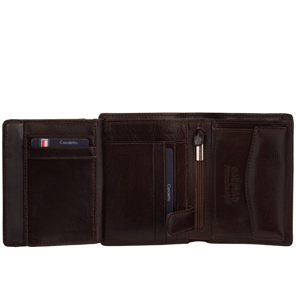 Portfel marki Canaletto to połączenie klasycznej formy, funkcjonalności i elegancji. Wykonany z naturalnej skóry licowej, zachwyca swoim wyrafinowanym designem i praktycznym wnętrzem. Kompaktowa forma, stylowe logo oraz dbałość o detale czynią go idealnym wyborem dla mężczyzn ceniących wysoką jakość i ponadczasowy styl.