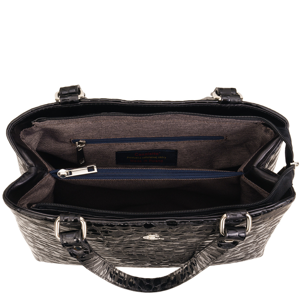 - Elegancka skórzana torebka Canaletto z naturalnej skóry licowej. Srebrne wykończenia, dwie pojemne komory, kieszonki na drobiazgi i wygodne rączki. Perfekcja stylu i funkcjonalności na co dzień!