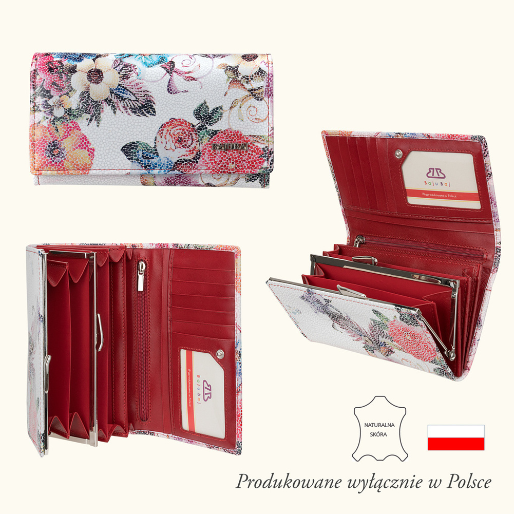 - Stylowy i pojemny portfel damski BajuBaj z naturalnej skóry licowej. Kieszeń na monety na bigiel, sześć przegródek na karty, okienko na zdjęcie i skrytka na zamek. Polski produkt!