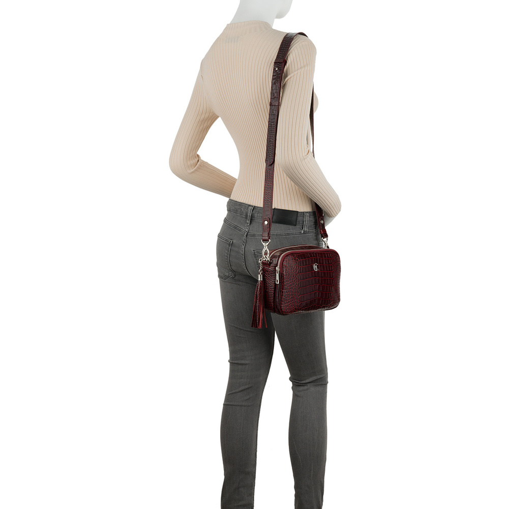 Torebka wykonana jest z naturalnej skóry licowej tłoczonej na wzór krokodyla, która charakteryzuje się eleganckim wykończeniem i wyjątkową trwałością. Skóra jest odporna na zadrapania i codzienne użytkowanie, dzięki czemu torebka przez długie lata zachowuje swój nienaganny wygląd.