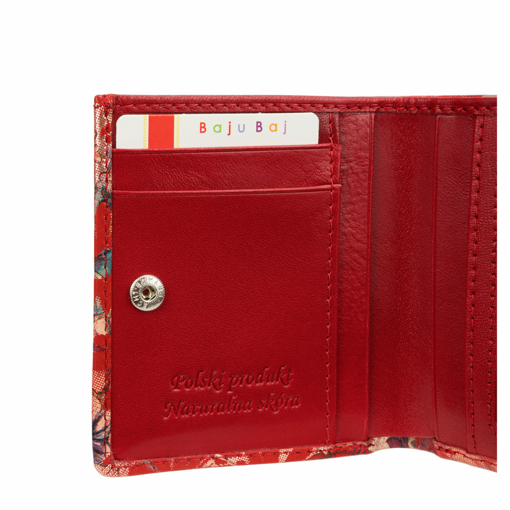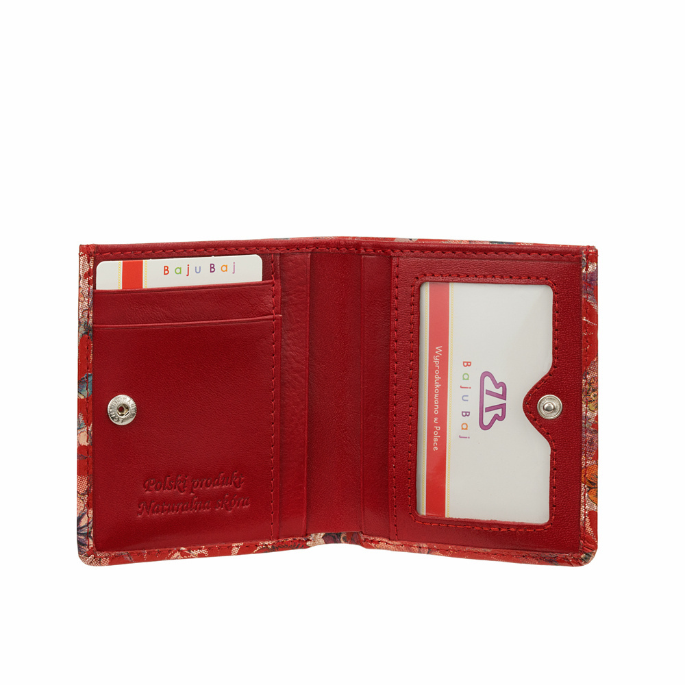 - Stylowy czerwony portfel damski BajuBaj z naturalnej kolorowej skóry. Około 6 miejsc na karty, kieszeń na banknoty, oryginalna kieszonka na drobne i bezpieczne zapięcie. Polski produkt najwyższej jakości!