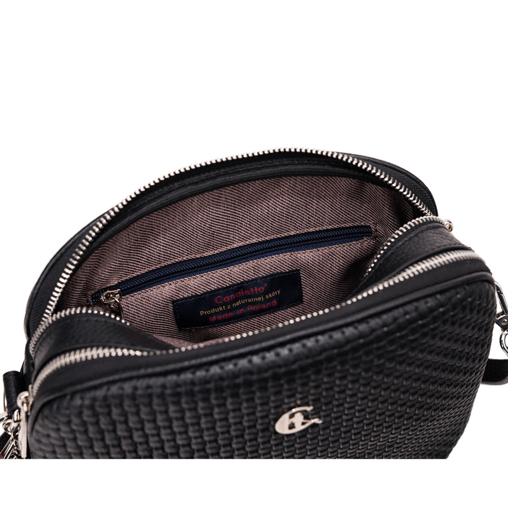 - Elegancka skórzana listonoszka Canaletto z tłoczeniem plecionki na przodzie. Dwie komory, kieszonki, regulowany pasek i srebrne okucia. Polski produkt, perfekcyjna jakość i styl!