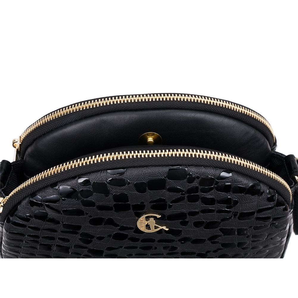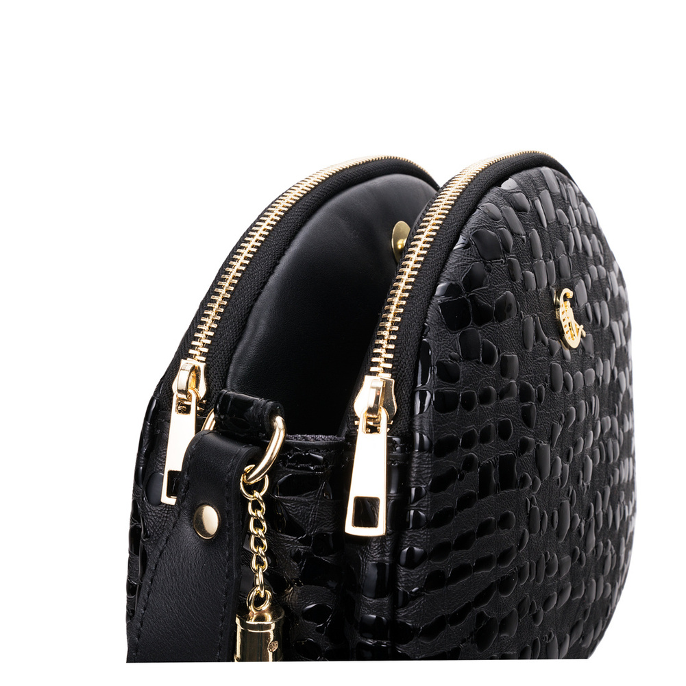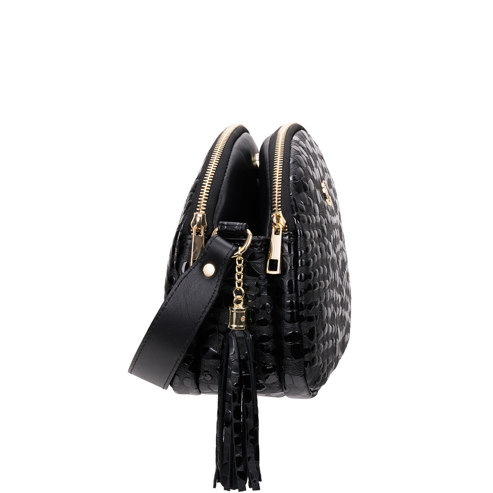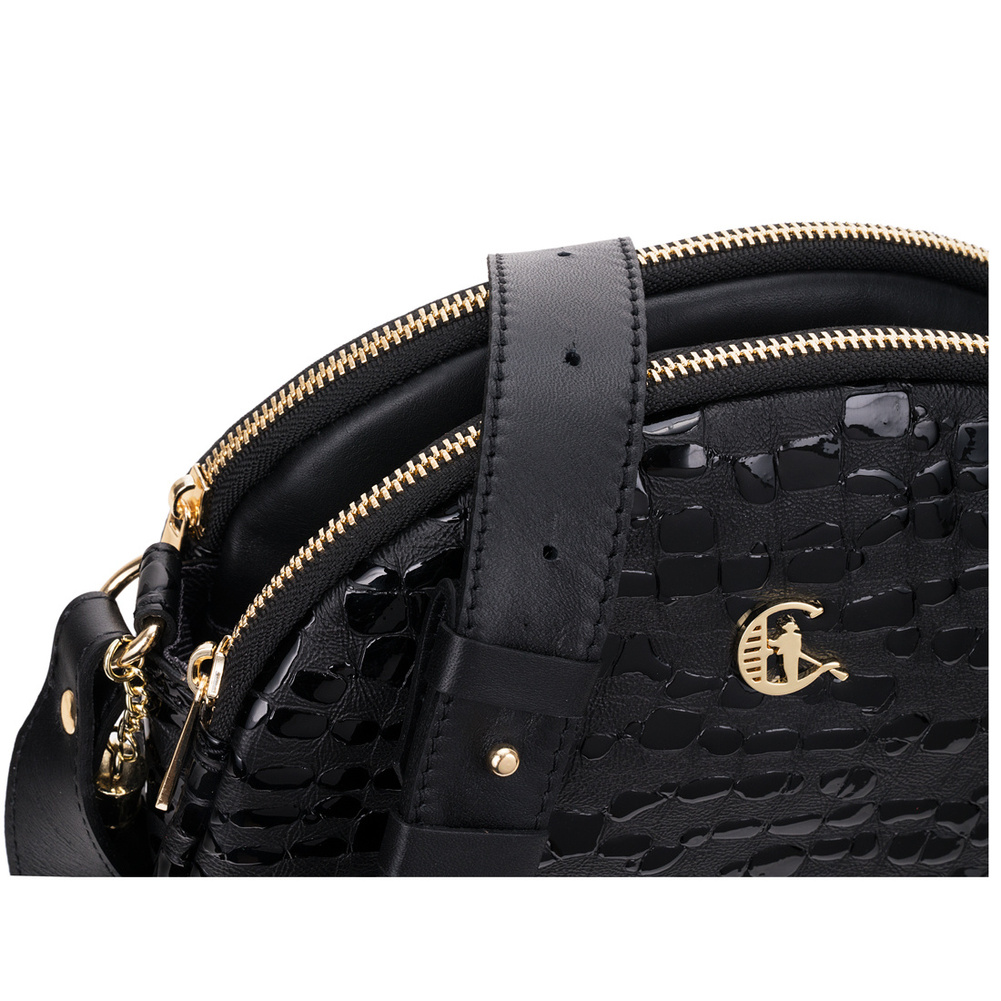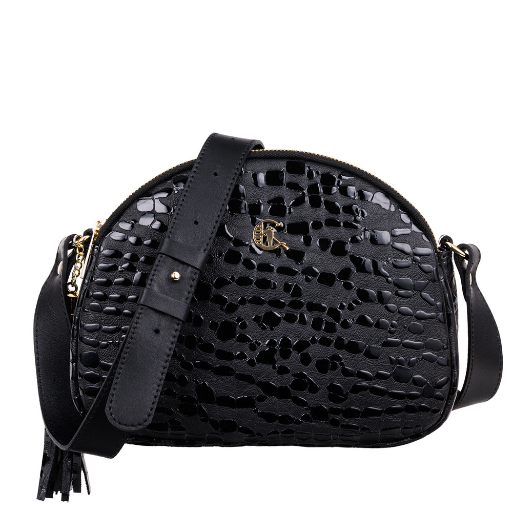 - Czarna torebka Canaletto wykonana z naturalnej skóry z imitacją kropli. Trzy komory, regulowany pasek i eleganckie detale. Polski produkt najwyższej jakości!
