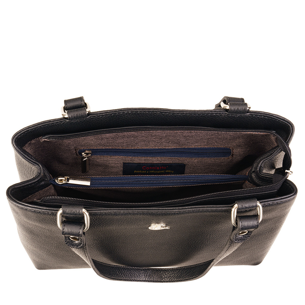 - Elegancka skórzana torebka Canaletto z naturalnej skóry licowej. Srebrne wykończenia, dwie pojemne komory, kieszonki na drobiazgi i wygodne rączki. Perfekcja stylu i funkcjonalności na co dzień!