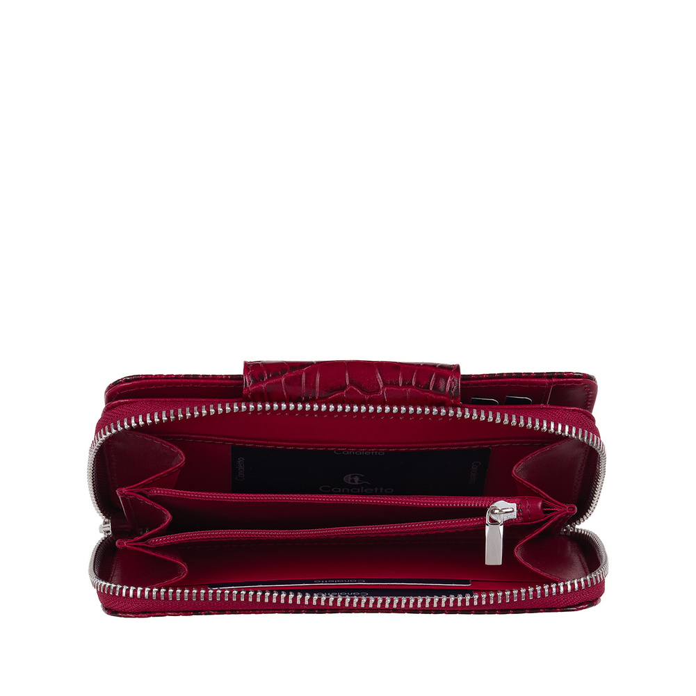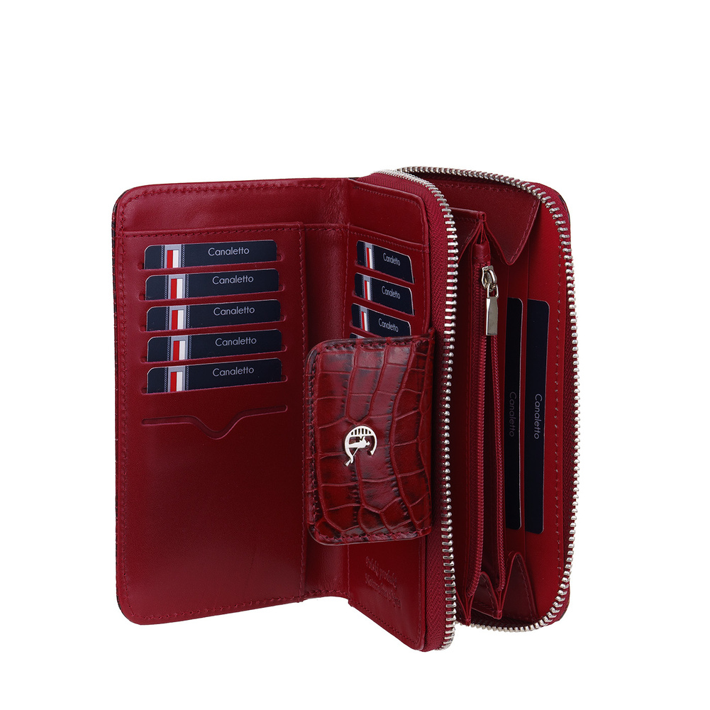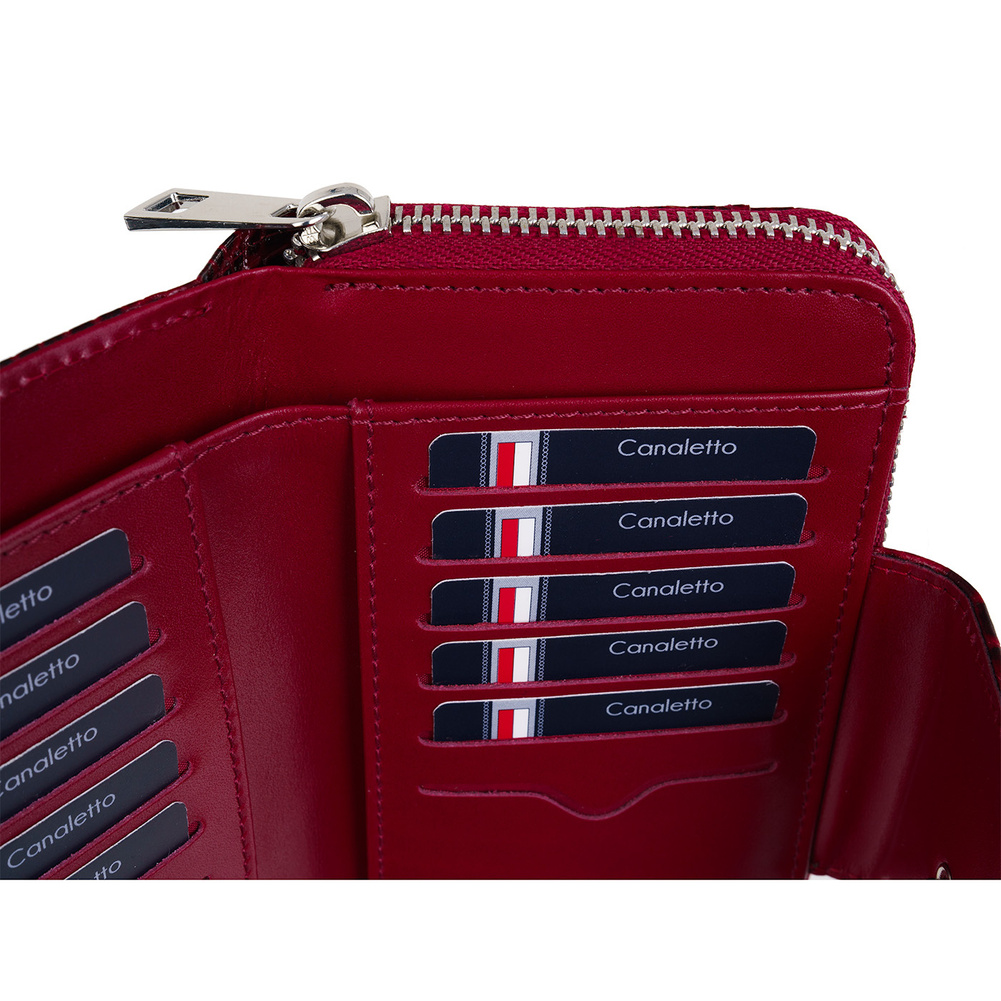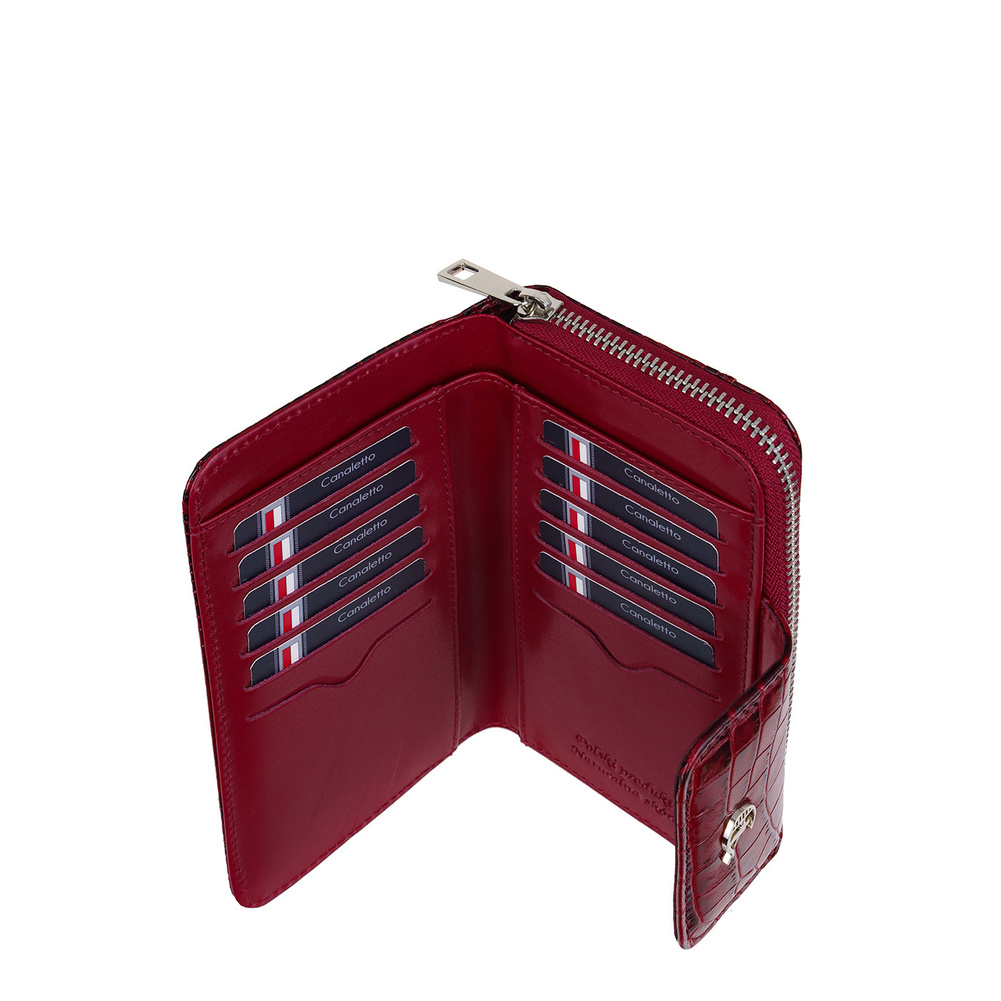 - Elegancki portfel damski Canaletto z włoskiej skóry licowej garbowanej roślinnie o wzorze krokodyla w bordowym kolorze. 15 przegródek na karty, kieszeń na monety z suwakiem i ochrona RFID. Luksus, styl i funkcjonalność w jednym.