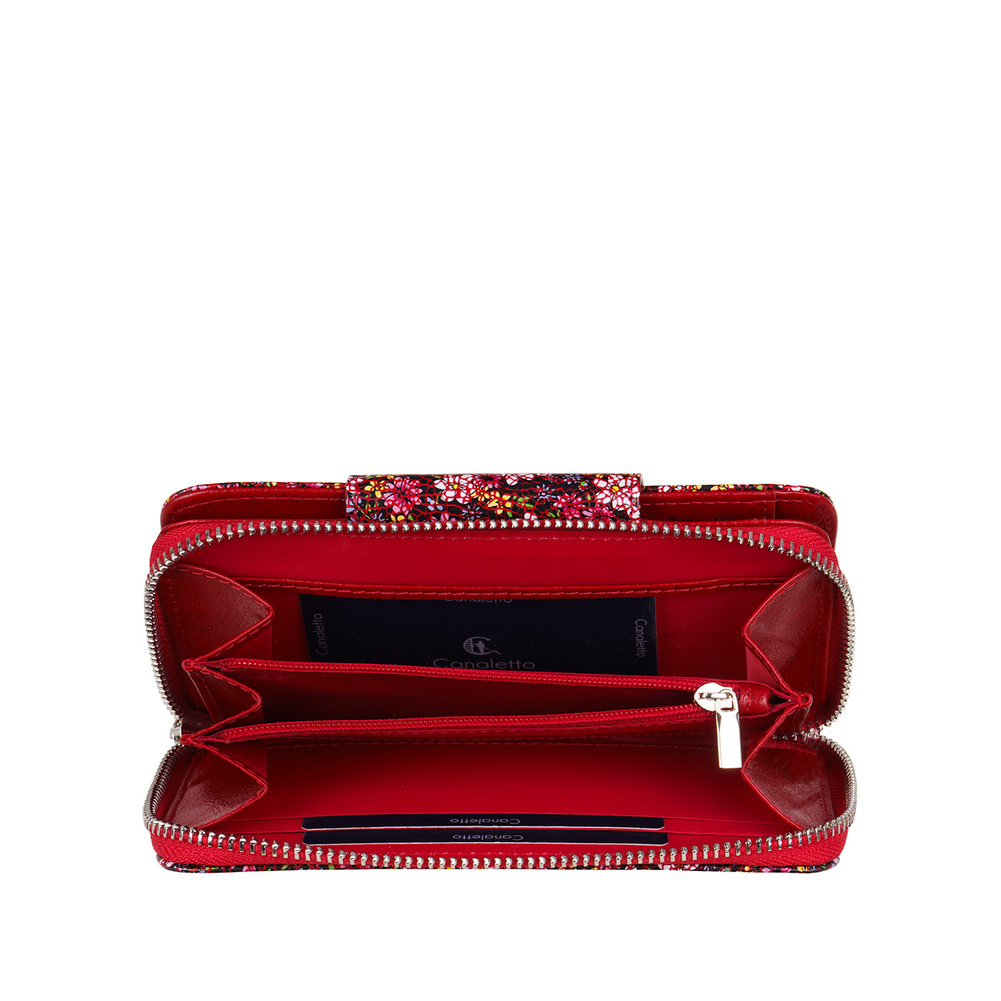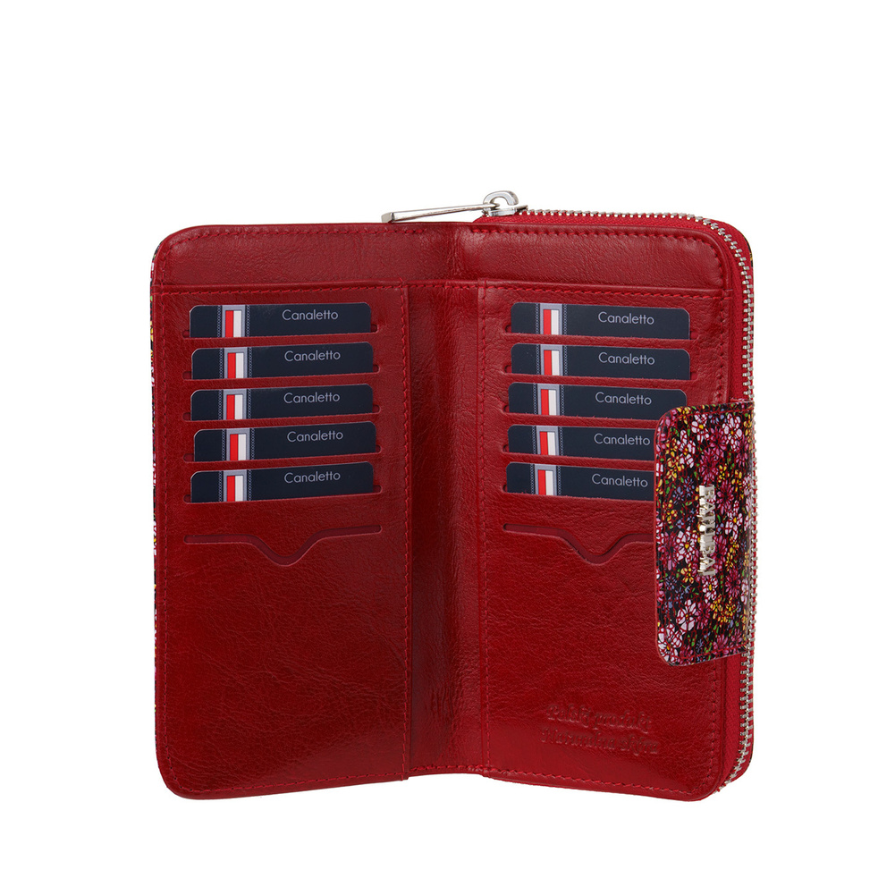 Portfel wykonano z naturalnej skóry licowej, która charakteryzuje się trwałością, odpornością na codzienne użytkowanie oraz pięknym, kolorowym wykończeniem. Wielobarwna kompozycja sprawia, że portfel wyróżnia się na tle innych modeli i wnosi odrobinę radości do codziennych stylizacji.