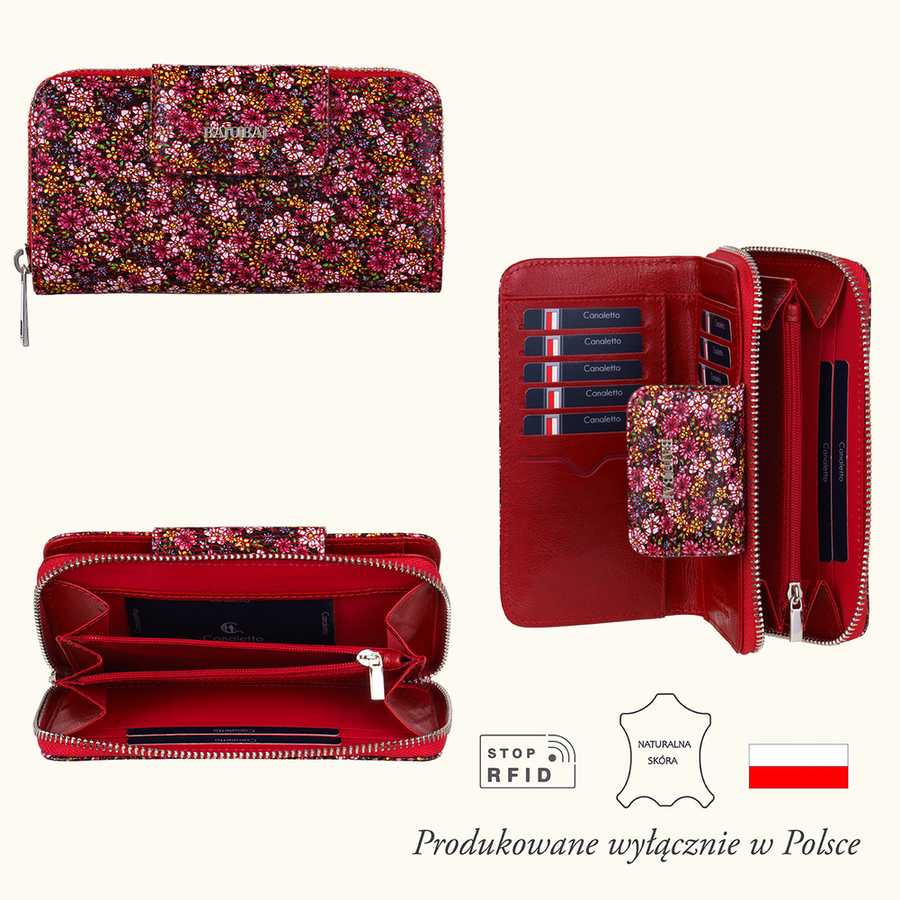 - Czerwony portfel damski BajuBaj z naturalnej skóry licowej. 15 przegródek, kieszeń na monety, zabezpieczenie RFID. Stylowy, praktyczny i trwały – idealny na prezent!